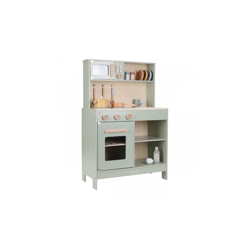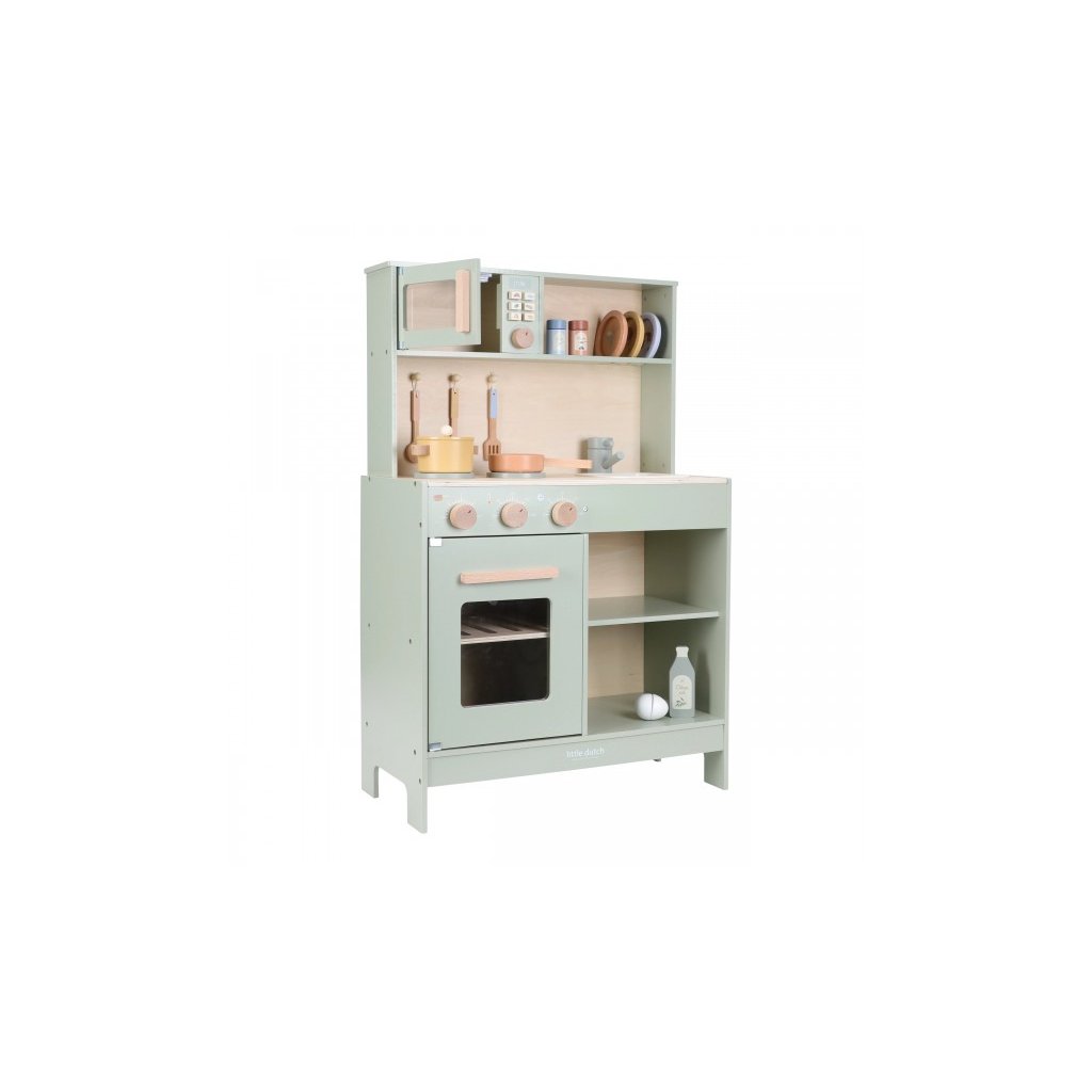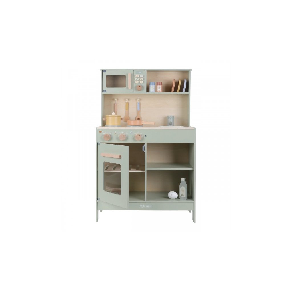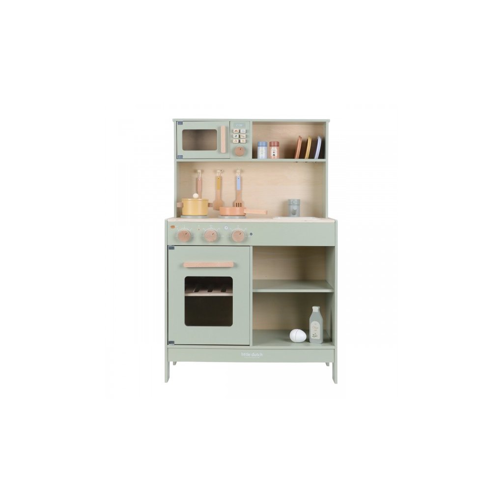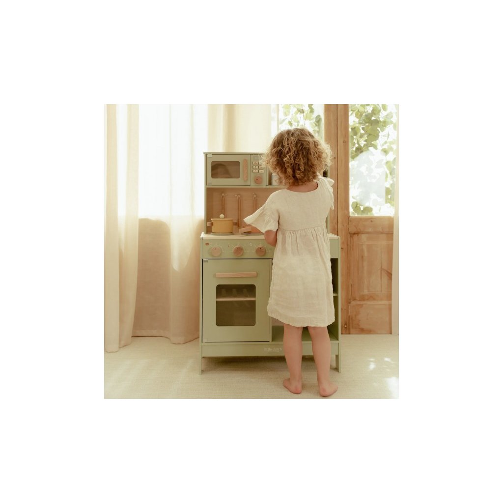 Krásná dřevěná kuchyňka Little Dutch nabízí vše, o čem malý kuchař či kuchařka sní, když vymýšlí nové recepty pro rodinu či své panenky a oblíbené plyšáky. S pánví, hrncem, třemi talířky a sadou kuchyňského náčiní není problém připravit několik chodů najednou. Trouba upeče koláč, na sporáku se uvaří zelenina, mikrovlnka rychle ohřeje, co je potřeba. K dispozici je i olivový olej, vajíčko, sůl a pepř na dochucení. Po práci si kuchař umyje ruce v dřezu. Skříňka nabízí prostor pro uložení potravin. Děti se učí napodobováním svých rodičů a zároveň taková hra rozvíjí kreativitu, soustředění, jemnou motoriku a sociální dovednosti. Kuchyňku můžete doplnit dalšími dřevěnými hračkami Little Dutch, např. kávovarem, toustovačem, kuchyňskou váhou, krájecím ovocem, krájecí zeleninou, čajovým servisem apod.