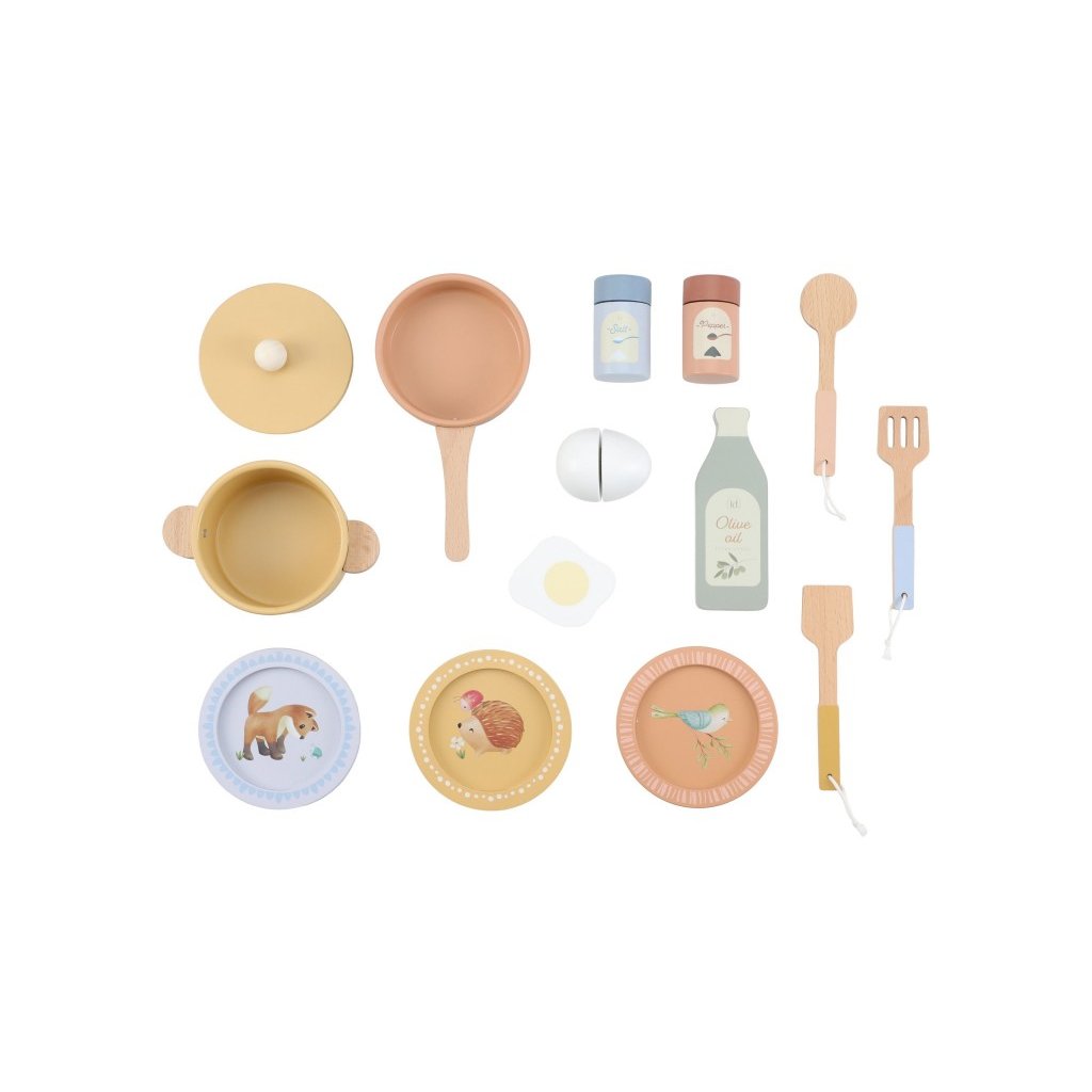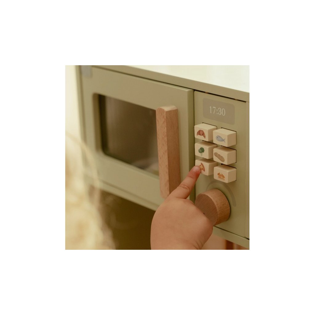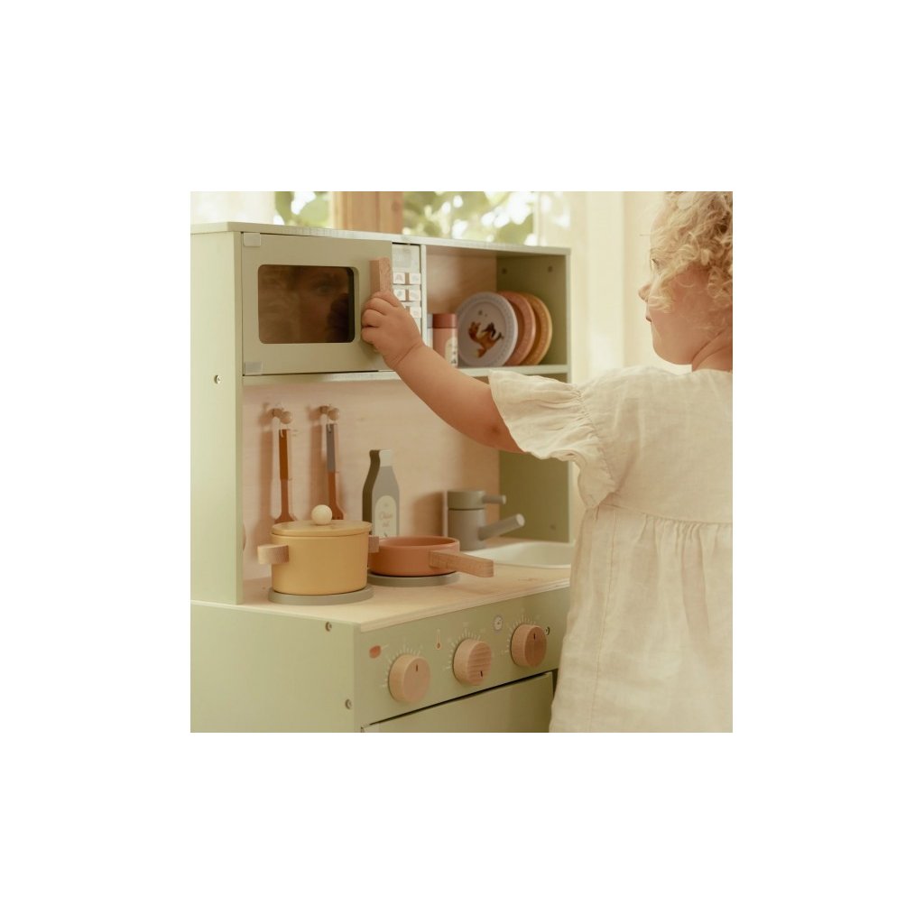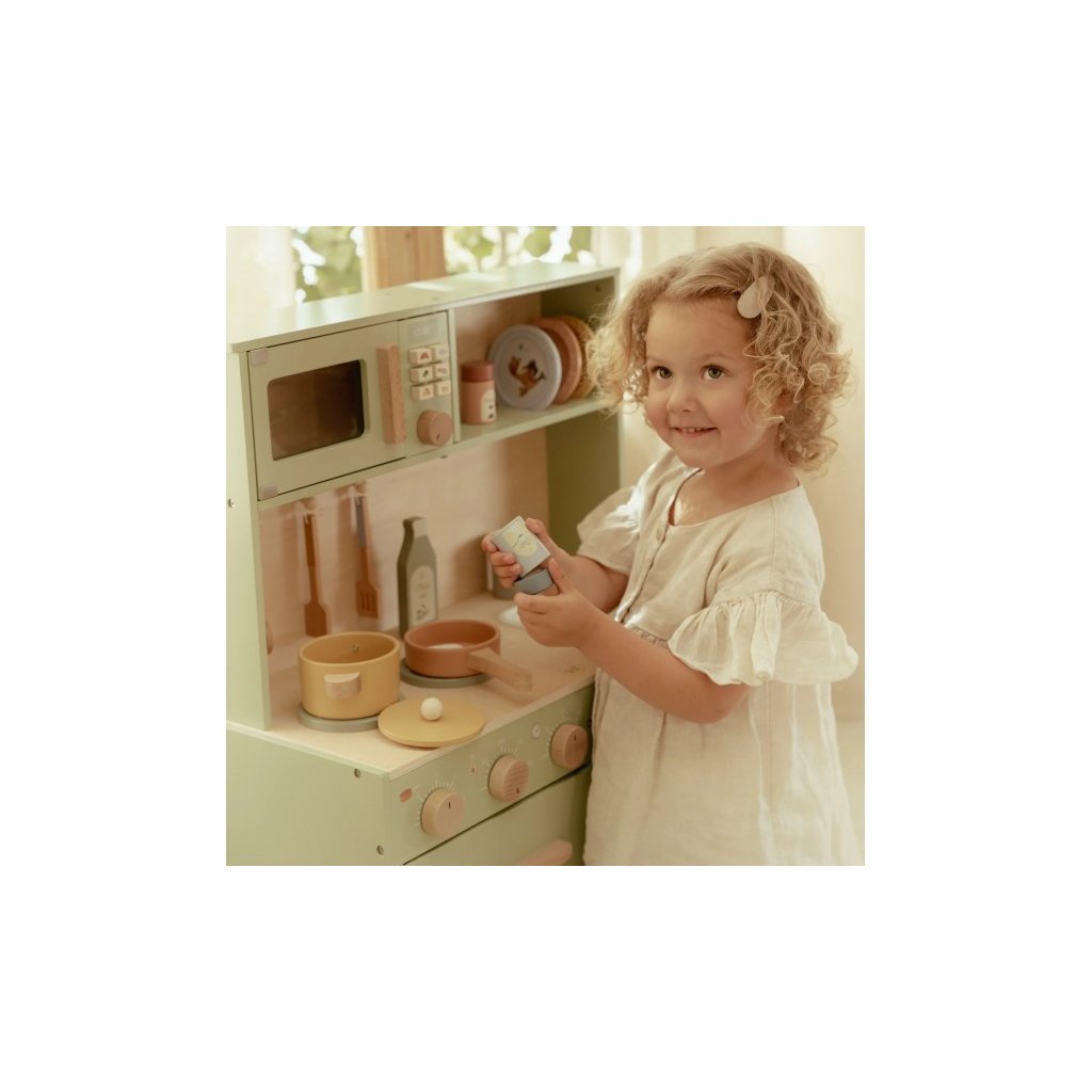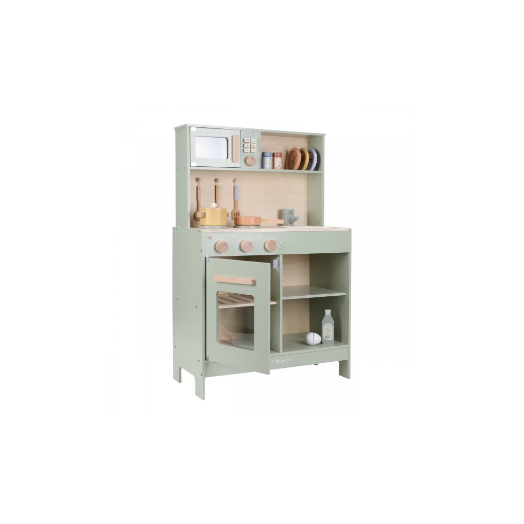 Krásná dřevěná kuchyňka Little Dutch nabízí vše, o čem malý kuchař či kuchařka sní, když vymýšlí nové recepty pro rodinu či své panenky a oblíbené plyšáky. S pánví, hrncem, třemi talířky a sadou kuchyňského náčiní není problém připravit několik chodů najednou. Trouba upeče koláč, na sporáku se uvaří zelenina, mikrovlnka rychle ohřeje, co je potřeba. K dispozici je i olivový olej, vajíčko, sůl a pepř na dochucení. Po práci si kuchař umyje ruce v dřezu. Skříňka nabízí prostor pro uložení potravin. Děti se učí napodobováním svých rodičů a zároveň taková hra rozvíjí kreativitu, soustředění, jemnou motoriku a sociální dovednosti. Kuchyňku můžete doplnit dalšími dřevěnými hračkami Little Dutch, např. kávovarem, toustovačem, kuchyňskou váhou, krájecím ovocem, krájecí zeleninou, čajovým servisem apod.
