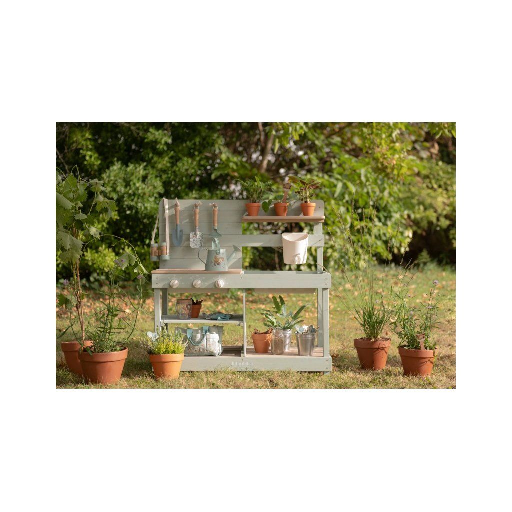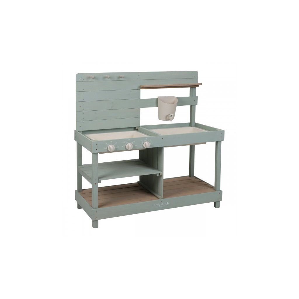 Dřevěná venkovní kuchyňka je ideální hračka na zahradu pro malé zahradníky i malé kuchaře, kteří milují tvoření z písku, vody a bláta. Kuchyňka se sporákem má otočné knoflíky, dva dřezy a dokonce funkční kohoutek s nádržkou na vodu, takže si dítě může samo pustit vodu a doplnit suroviny pro „vaření“ venku. Praktický detail jsou také dvě velké vaničky schované pod odklopnými deskami, které jsou jako stvořené pro hraní s vodou. Kromě hry na vaření je kuchyňka skvělá i jako praktický pult pro malé zahradníky, na kterém mohou např. sázet květiny i sít semínka do květináčů, zalévat je a po skončení umýt všechno zahradnické náčiní vodou, aby bylo připravené na příští zahradnické aktivity. Kuchyňka podporuje kreativitu, fantazii a samostatnou hru venku.
