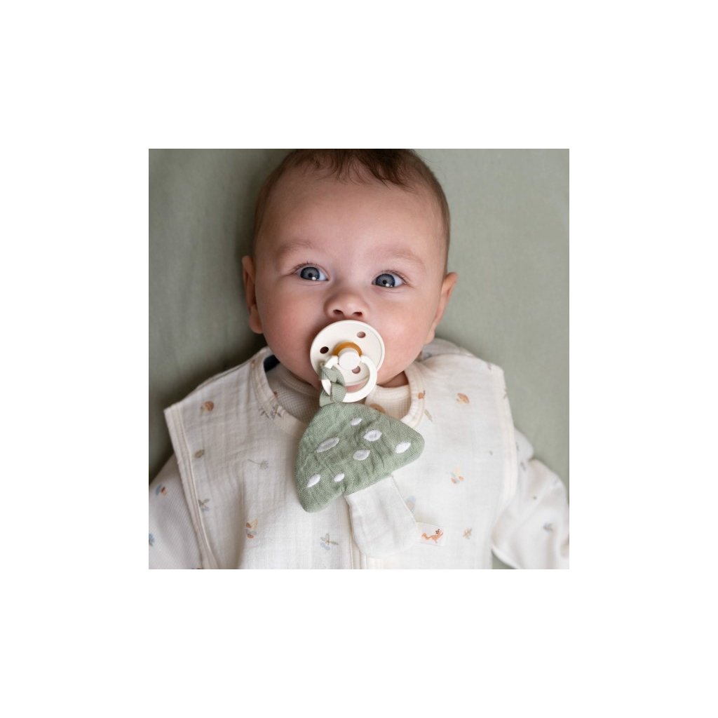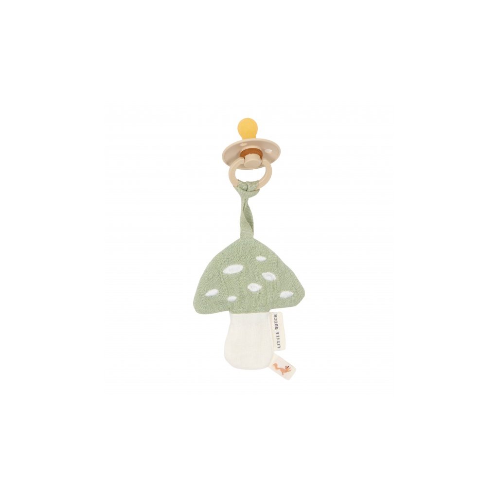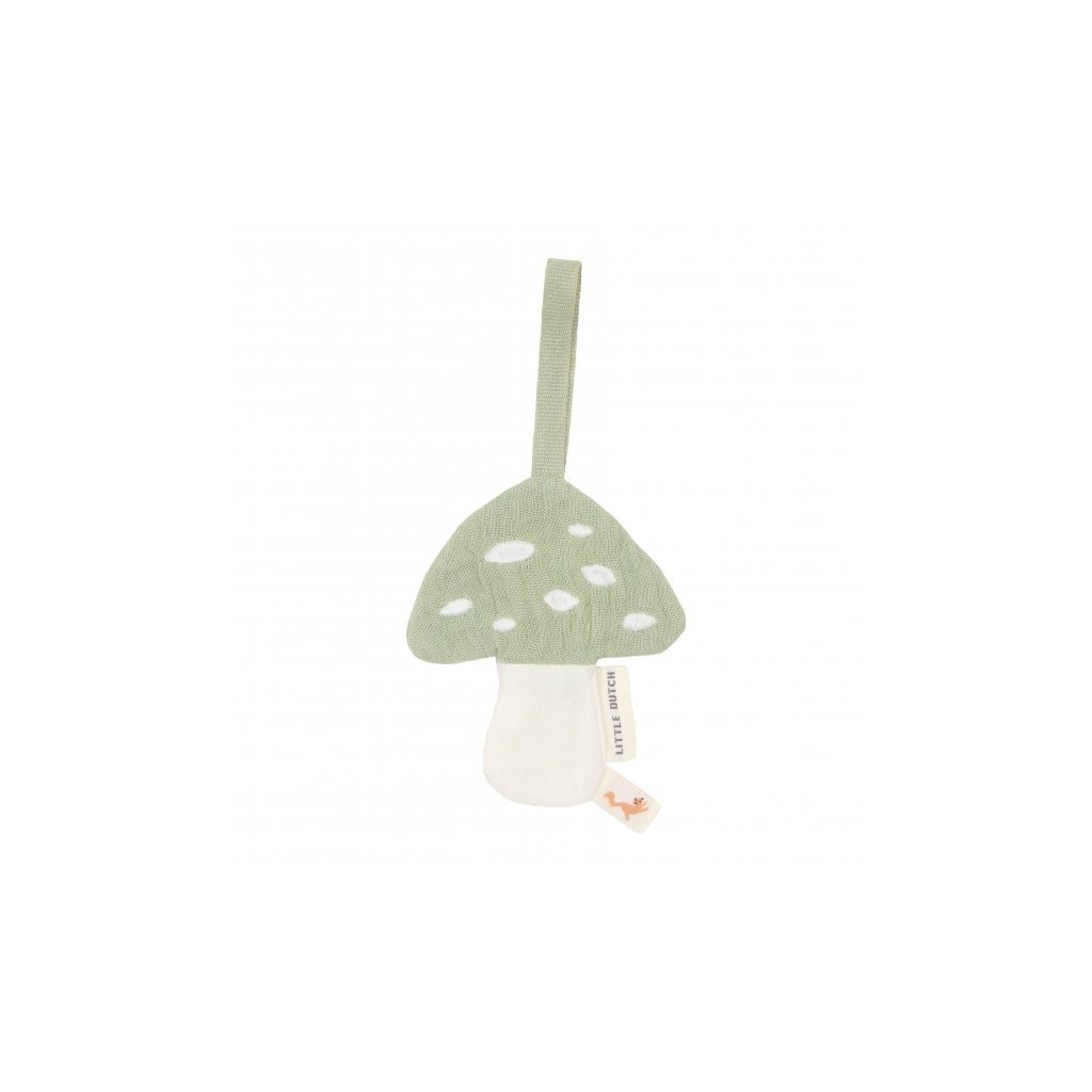 Přívěsek z jemného mušelínu v podobě houbičky s úchytem pro šidítko láká dítě ke hraní i zkoumání a rodičům pomůže rychle najít šidítko v postýlce či kočárku. Hračka je součástí designové kolekce hraček a doplňků Little Dutch Forest Friends inspirované životem v lese.