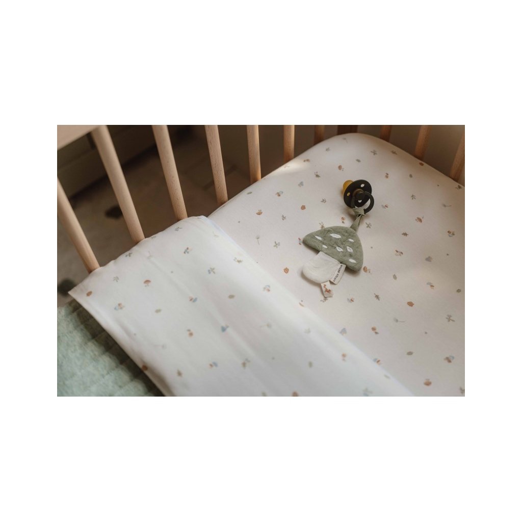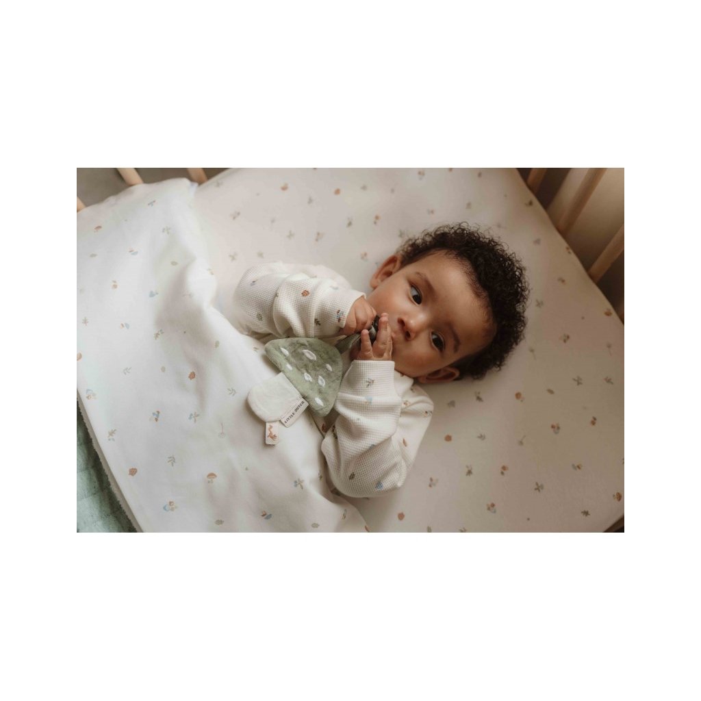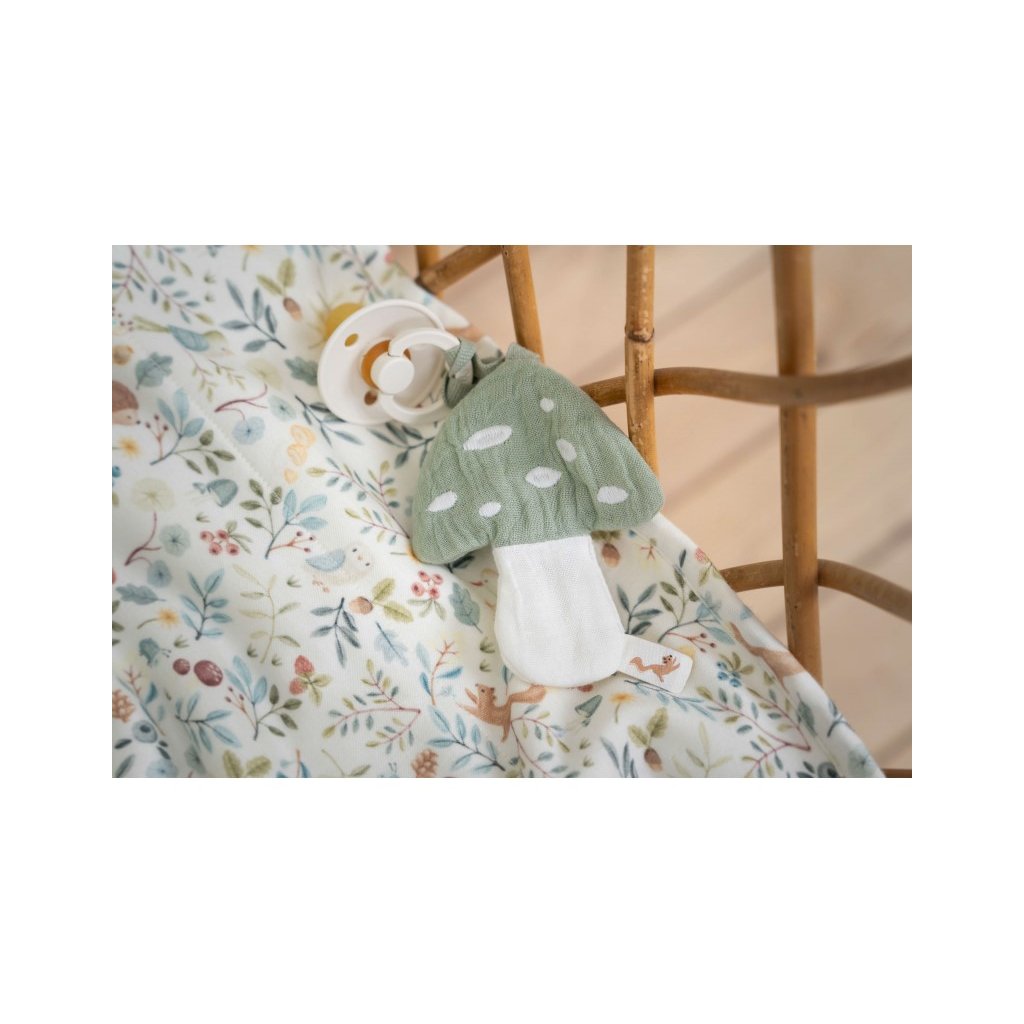 Přívěsek z jemného mušelínu v podobě houbičky s úchytem pro šidítko láká dítě ke hraní i zkoumání a rodičům pomůže rychle najít šidítko v postýlce či kočárku. Hračka je součástí designové kolekce hraček a doplňků Little Dutch Forest Friends inspirované životem v lese.