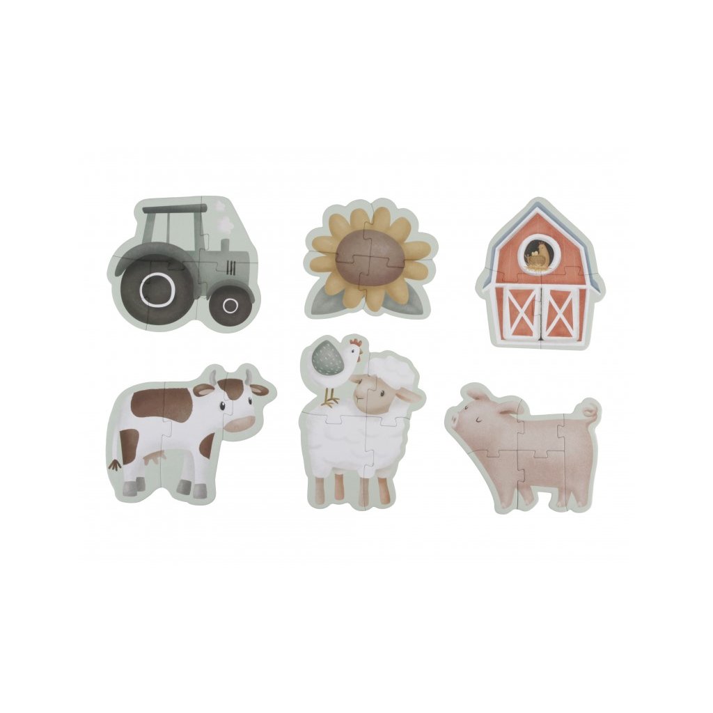 Sada obsahuje 6 variant puzzle skládaček pro nejmenší s krásnými ilustracemi ze života na farmě. Jednotlivé skládačky mají 3, 4 nebo 5 dílků z pevného kartonu, které jsou dokonale tvarované pro malé dětské ručičky. Hračka je součástí designové kolekce hraček a doplňků Little Dutch Farma. Puzzle rozvíjí jemnou motoriku dítěte i dovednosti jako řešení problémů, trpělivost a rozpoznávání tvarů.