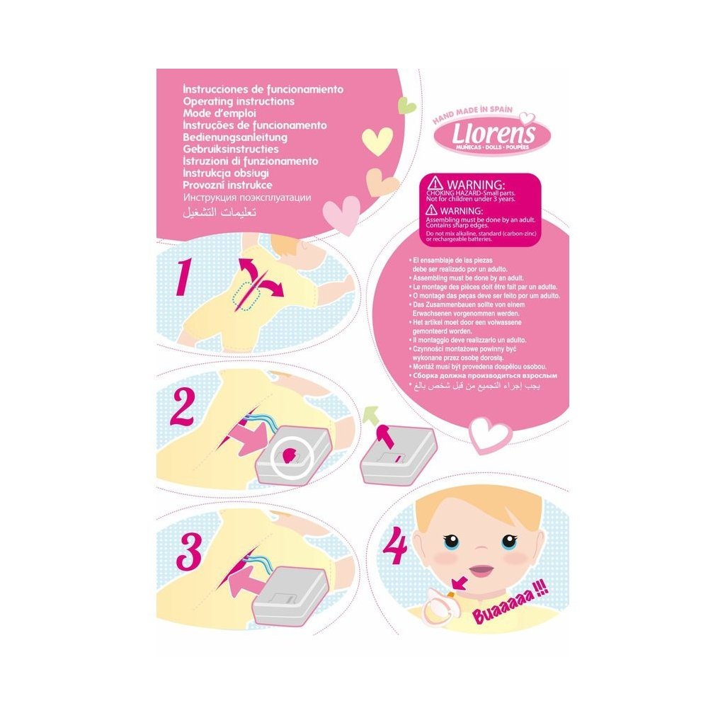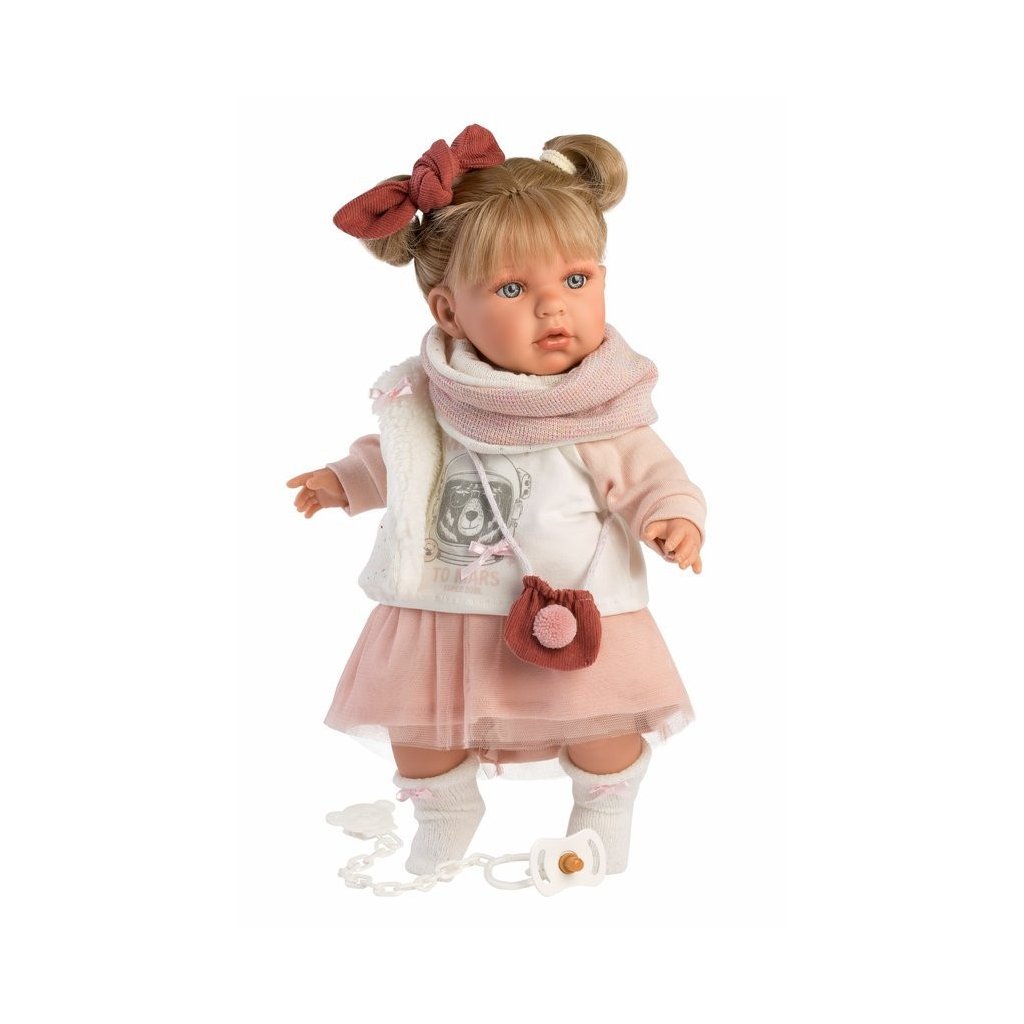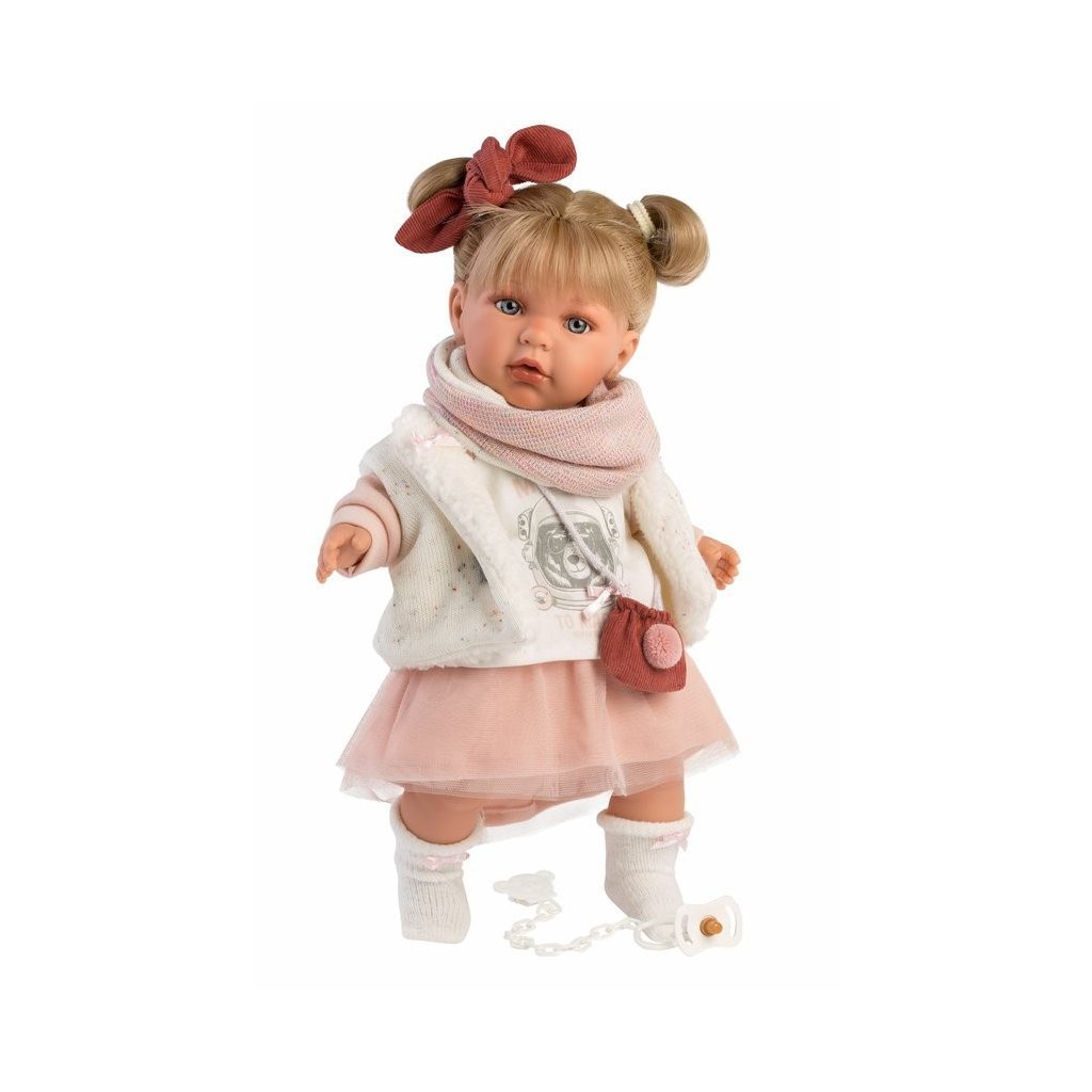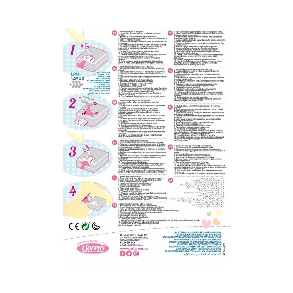 Mluvící a plačící panenka (po vyjmutí pojistky ihned funkční) s měkkým látkovým tělem a s vlásky po celé hlavě. Hlava a končetiny jsou vyrobené z kvalitního měkčeného vinylu. Po vytažení dudlíku z úst začne panenka říkat „mama“, „papa“ a vydávat reálný zvuk plačícího dítěte, který lze utišit opět magnetickým dudlíkem. Velikost panenky 42 cm. Ručně vyrobeno ve Španělsku, baleno v dárkové krabici. Doporučený věk od 3 let. K panence je možné dokoupit další originální oblečení z nabídky Llorens pro panenky velikosti 42 cm. Součástí balení je 3 x knoflíková baterie LR44 s návodem na její výměnu. Baterie jsou spotřební zboží a proto jejich vybití není důvodem k reklamaci panenky.