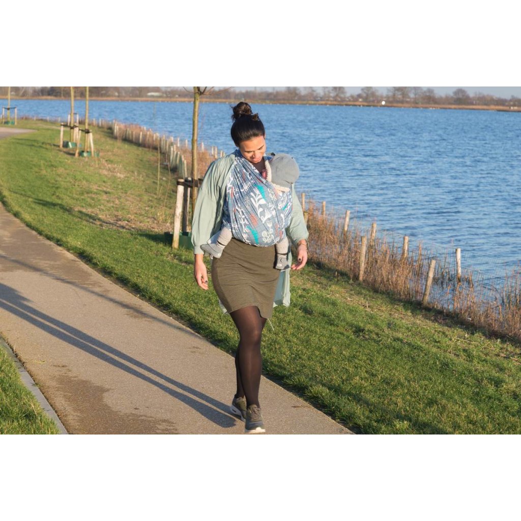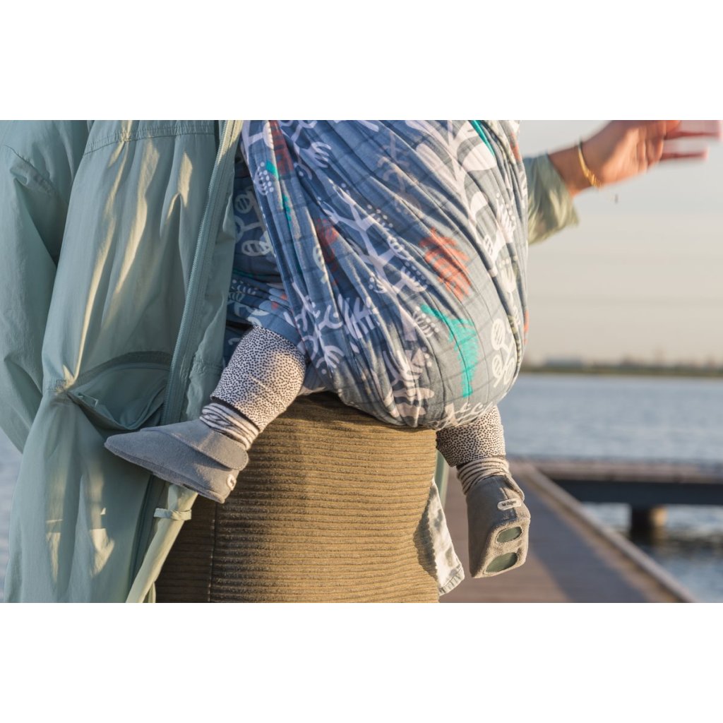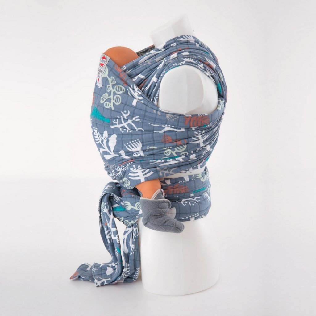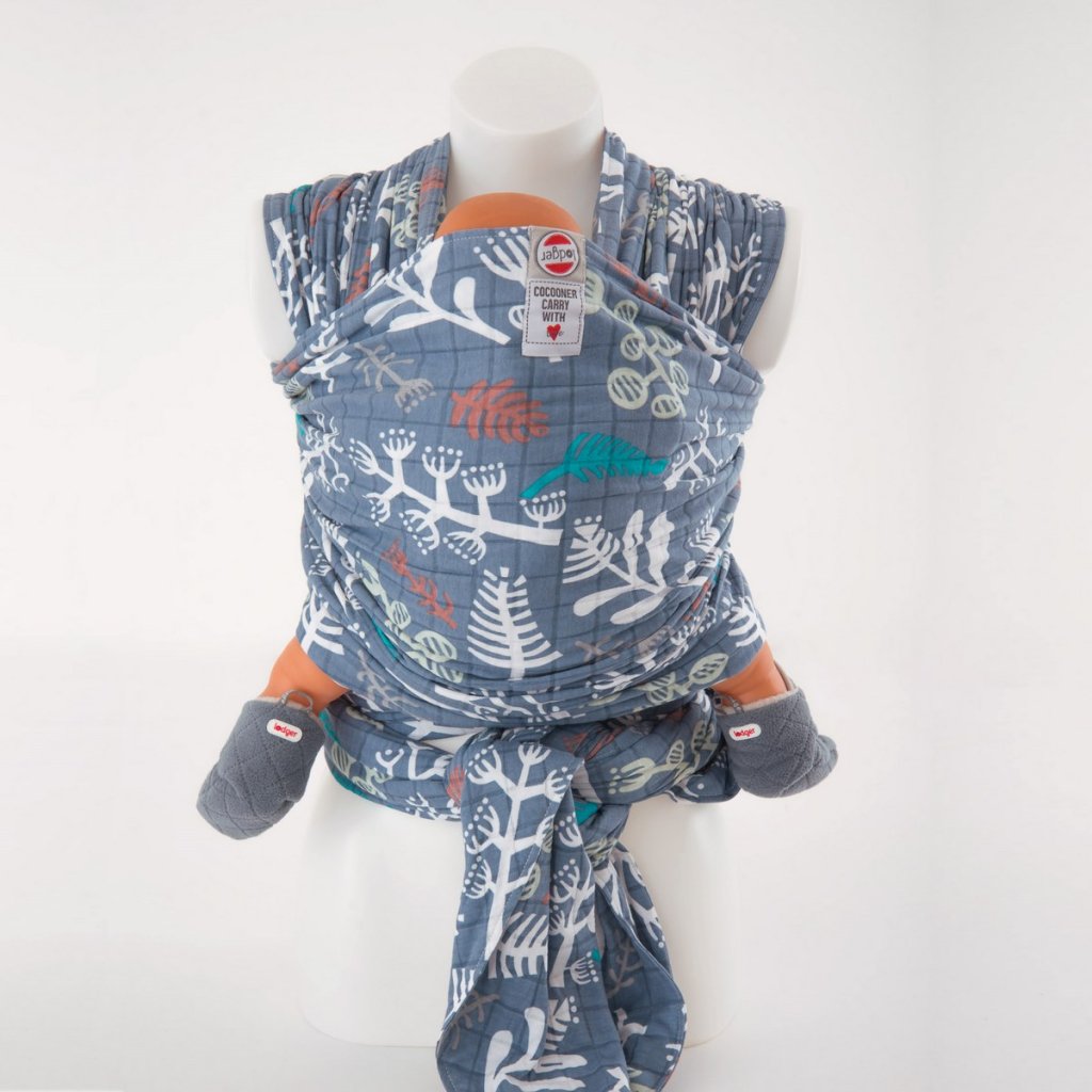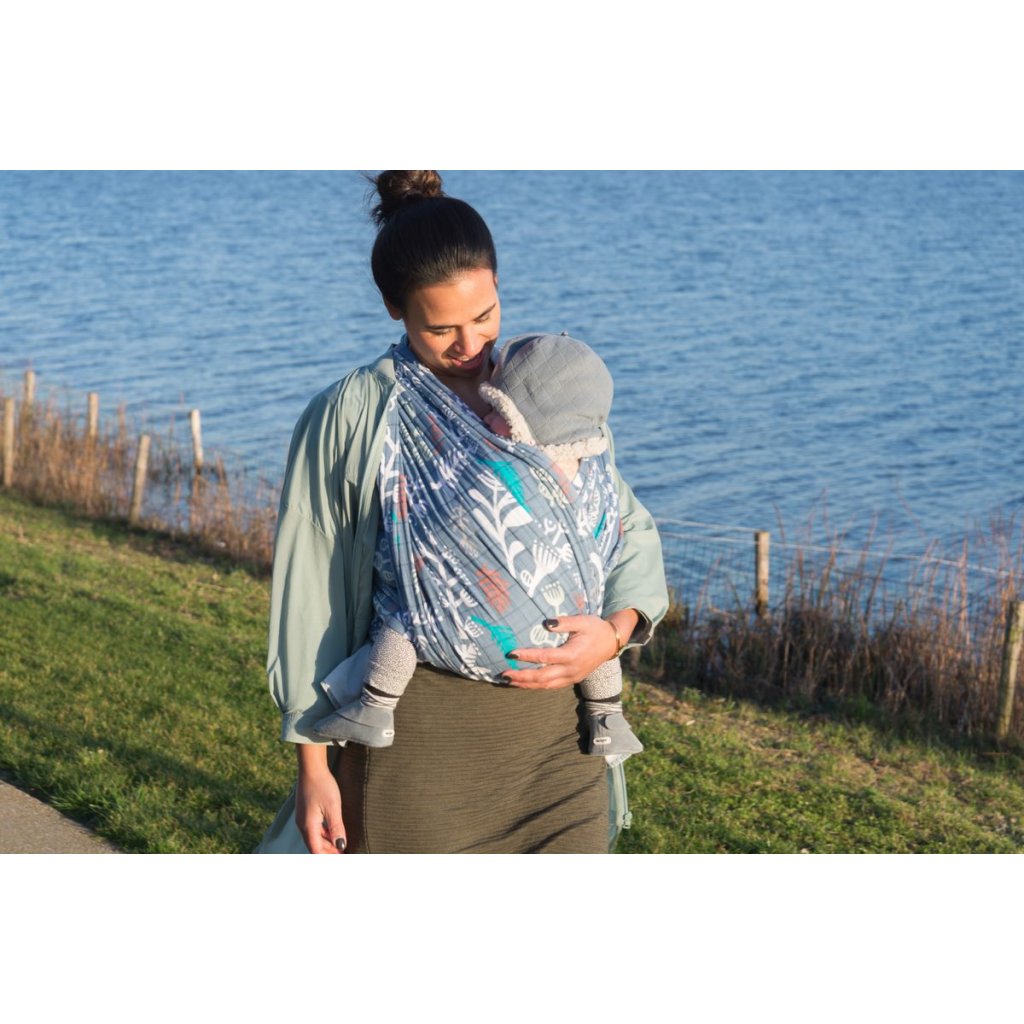 Cocooner, ideální dětské nosítko, které zajišťuje přirozenou a ergonomickou polohu pro vás i vaše dítě. Můžete ho používat od narození až do 1,5 roku věku dítěte (min. 3,5 kg - max. 12 kg), a to pro nošení na břiše, na boku i na zádech. Tento šátek má modrou barvu s potiskem rostlin.