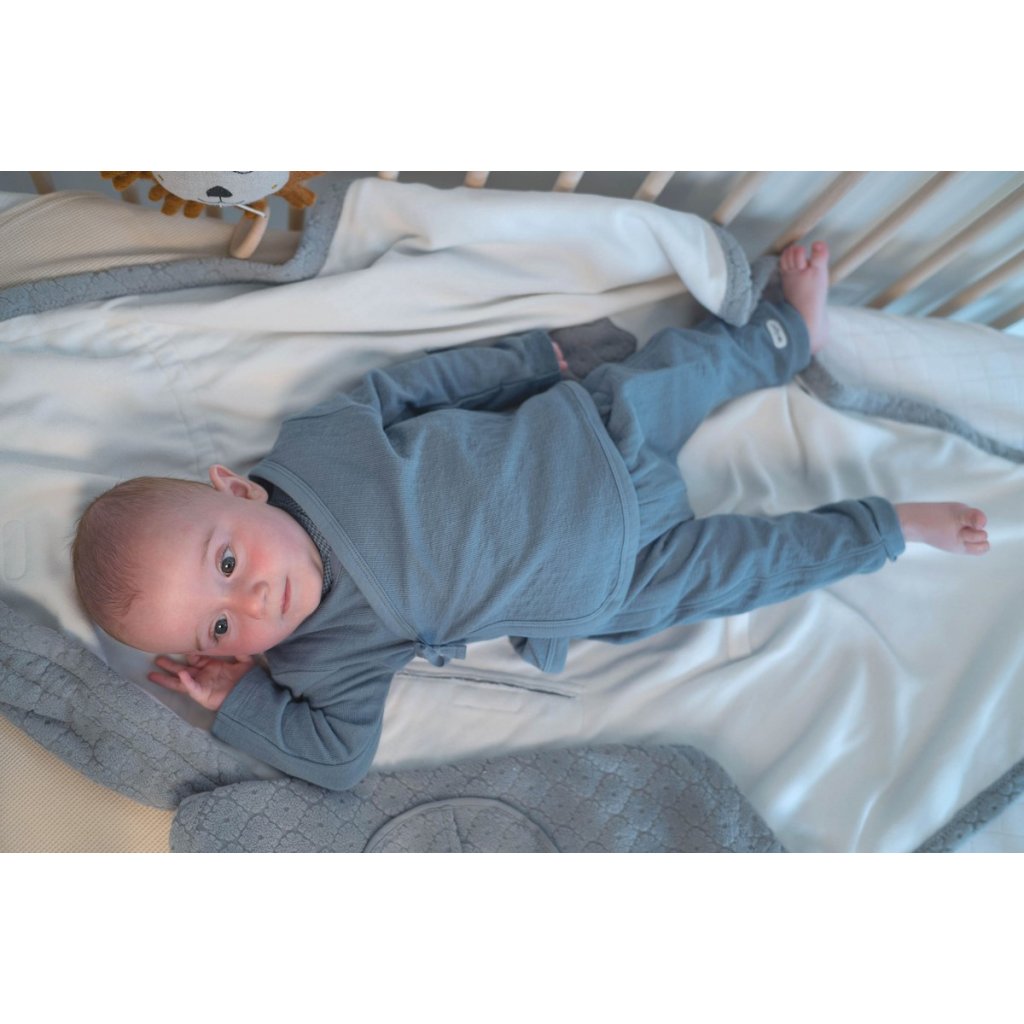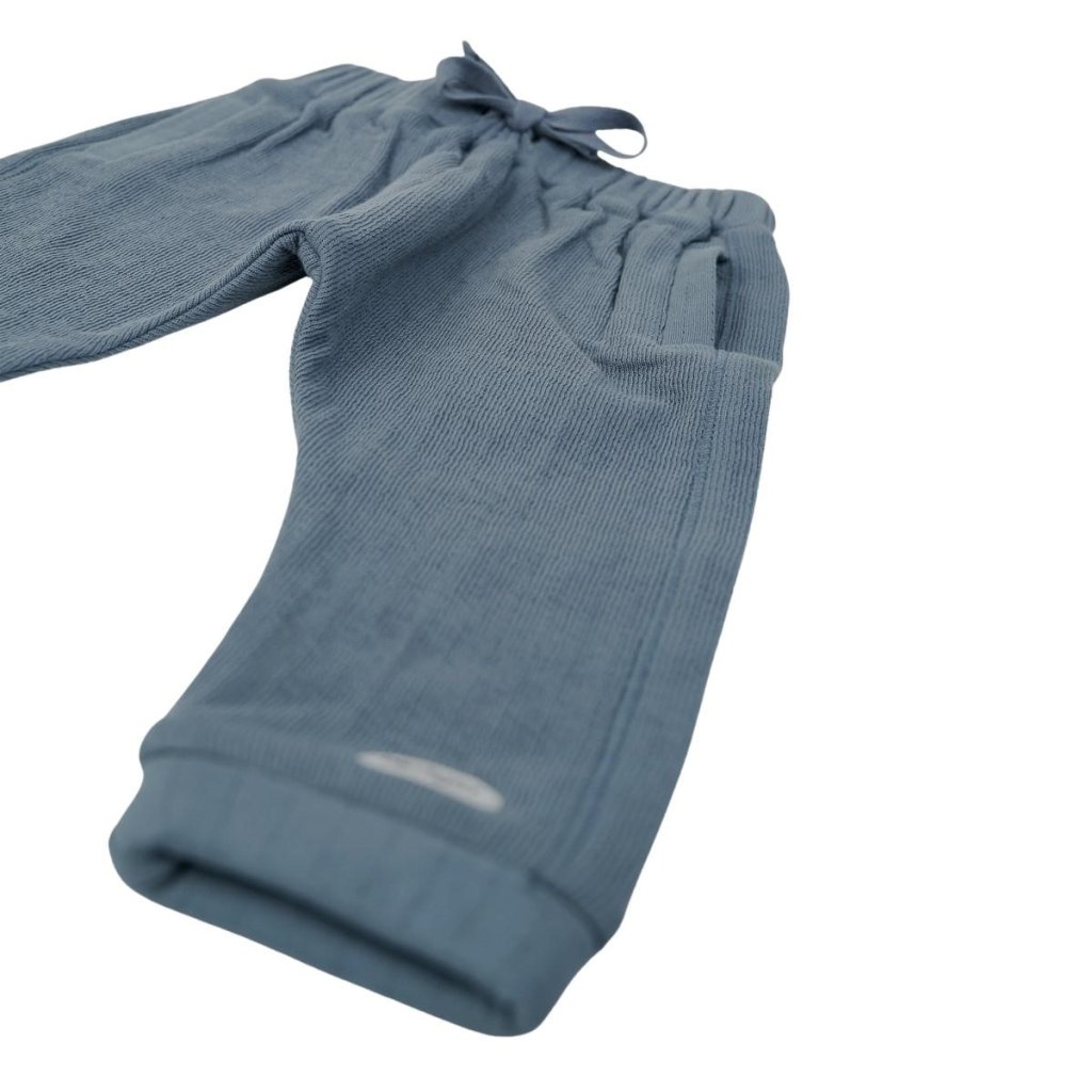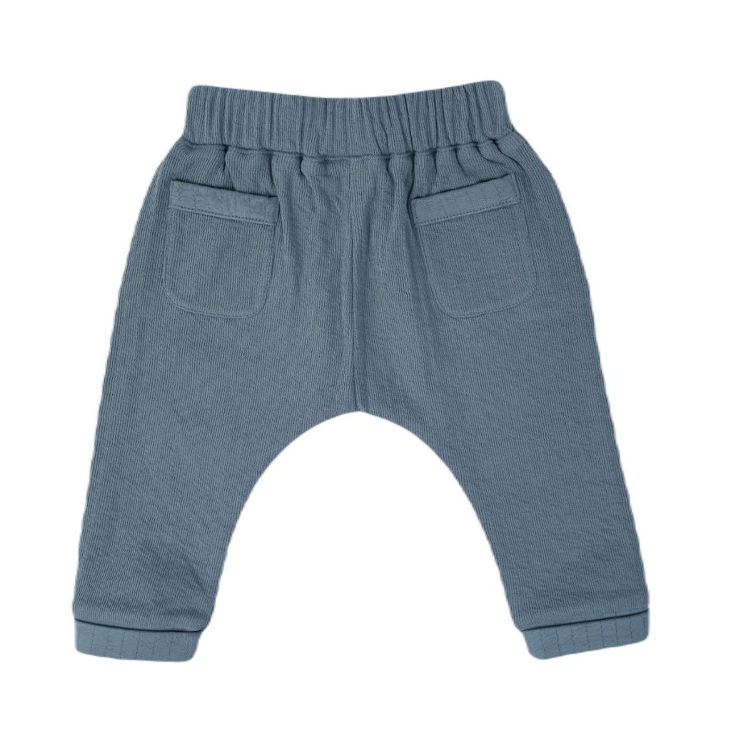 Tepláčky s elastickým pasem. Jsou vyrobené z dvouvrstvé bavlny s žebrovanou strukturou. Tepláčky mají nízký sed, takže nebudou vaše miminko nikde tlačit nebo škrtit a nabízejí tak více prostoru pro plenku. Tepláčky mají dvě falešné kapsy na přední straně a dvě opravdové kapsy na zadní straně. Můžete je zkombinovat se zavinovacími kabátky a vytvořit tak stylový outfit na podzim a jaro.