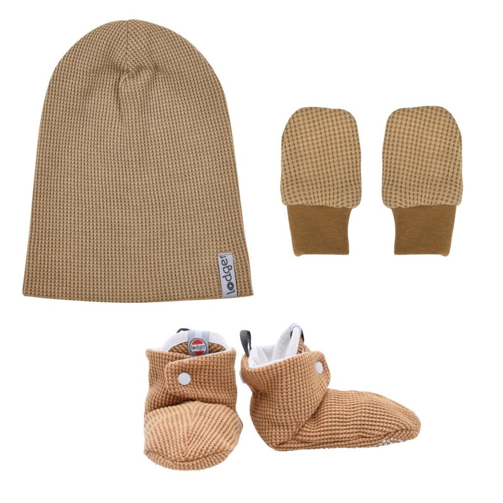 Krásný novorezenecký set. Set se skládá z Beanie Ciumbelle 0-6 měsíců, Slipper Ciumbelle 0-3 měsíce a Mittens Ciumbelle. Ideální jako dárek k narození miminka! Set má hořčicovou barvu.