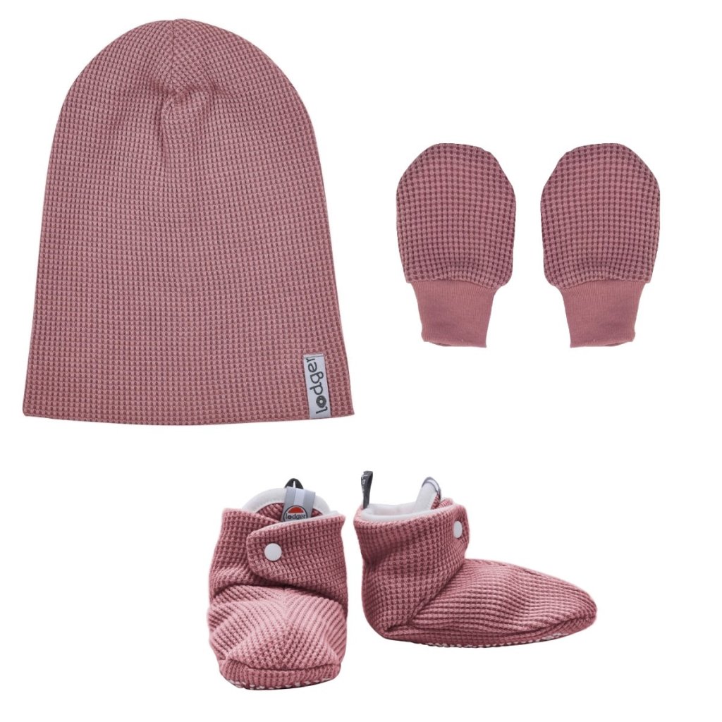 Krásný novorezenecký set. Set se skládá z Beanie Ciumbelle 0-6 měsíců, Slipper Ciumbelle 0-3 měsíce a Mittens Ciumbelle. Ideální jako dárek k narození miminka! Set má vínovou barvu