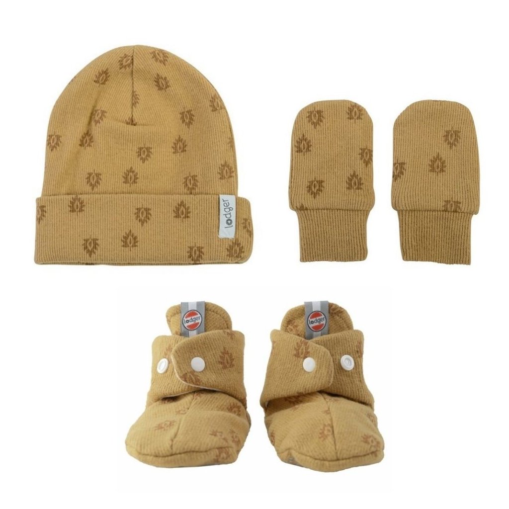 Krásný novorezenecký set. Set se skládá z Beanie Rib 0-6 měsíců, Slipper Rib 0-3 měsíce a Mittens Rib. Ideální jako dárek k narození miminka! Set má hořčicovou barvu s potiskem.