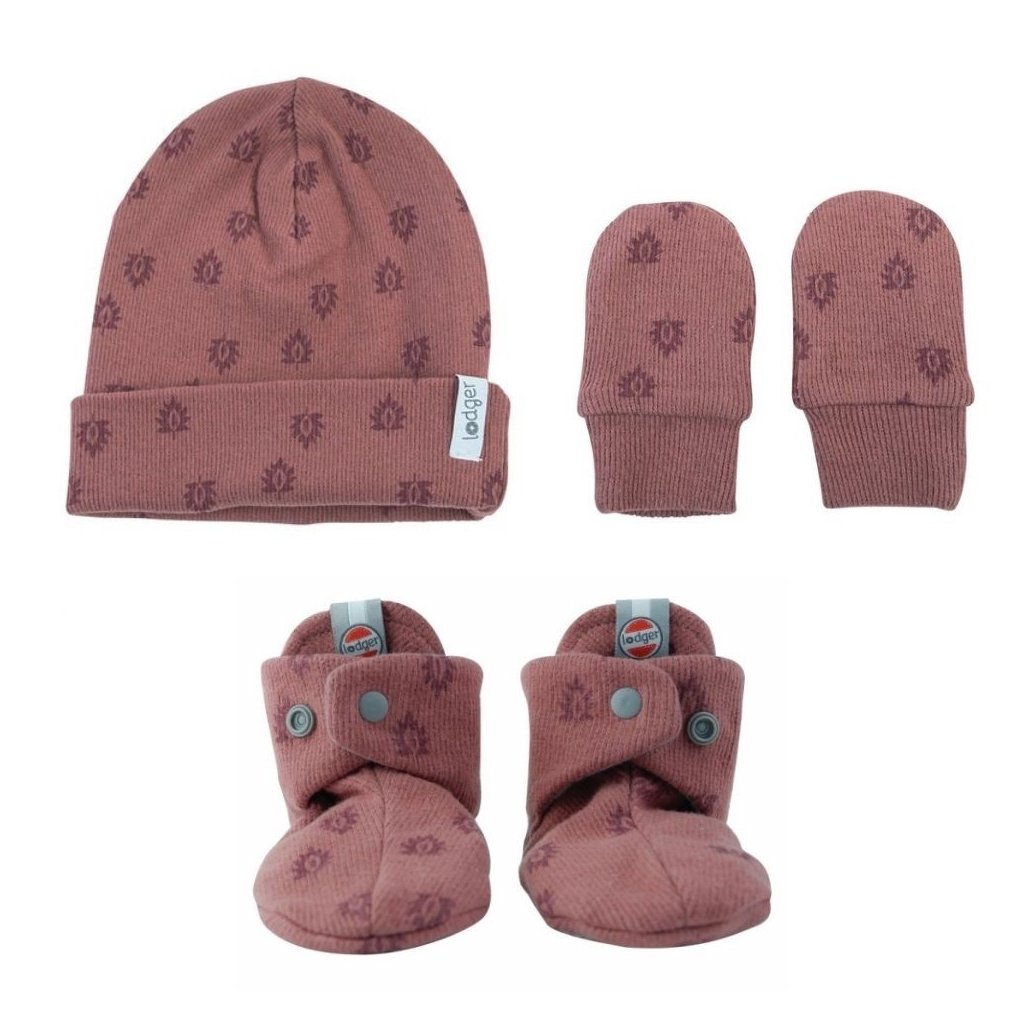 Krásný novorezenecký set. Set se skládá z Beanie Rib 0-6 měsíců, Slipper Rib 0-3 měsíce a Mittens Rib. Ideální jako dárek k narození miminka! Set má vínovou barvu s potiskem.