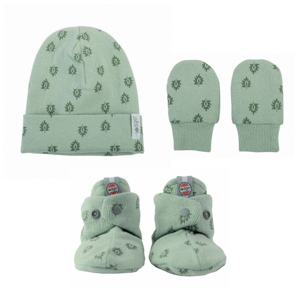 Krásný novorezenecký set. Set se skládá z Beanie Rib 0-6 měsíců, Slipper Rib 0-3 měsíce a Mittens Rib. Ideální jako dárek k narození miminka! Set má zelenkavou barvu s potiskem.