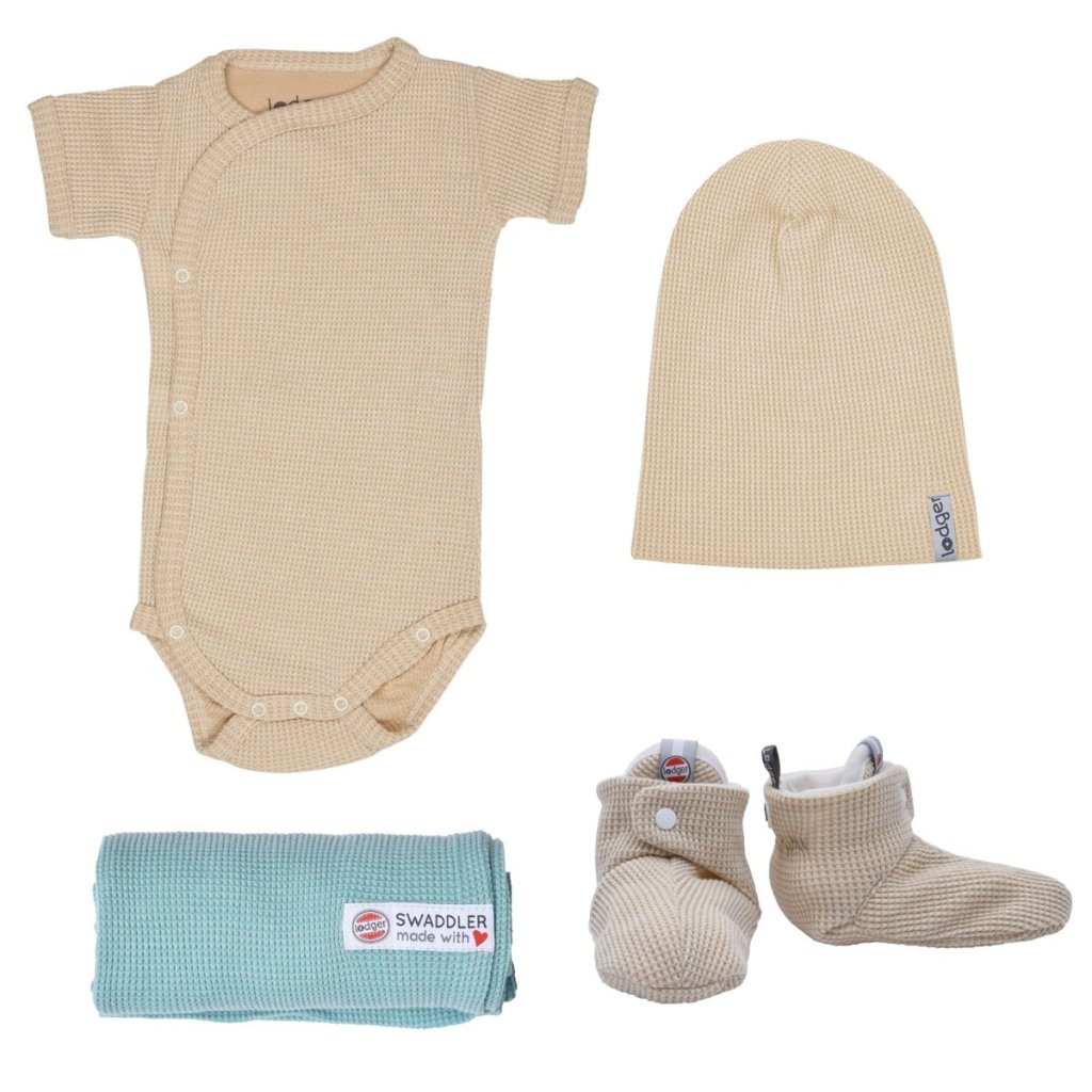 Krásný novorezenecký set. Set se skládá z Beanie Ciumbelle 0-6 měsíců, Romper SS Ciumbelle vel. 56, Slipper Ciumbelle 0-3 měsíců, Swaddler Ciumbelle. Ideální jako dárek k narození miminka! Set má krémovou barvu + swaddler v barvě Silt Green.