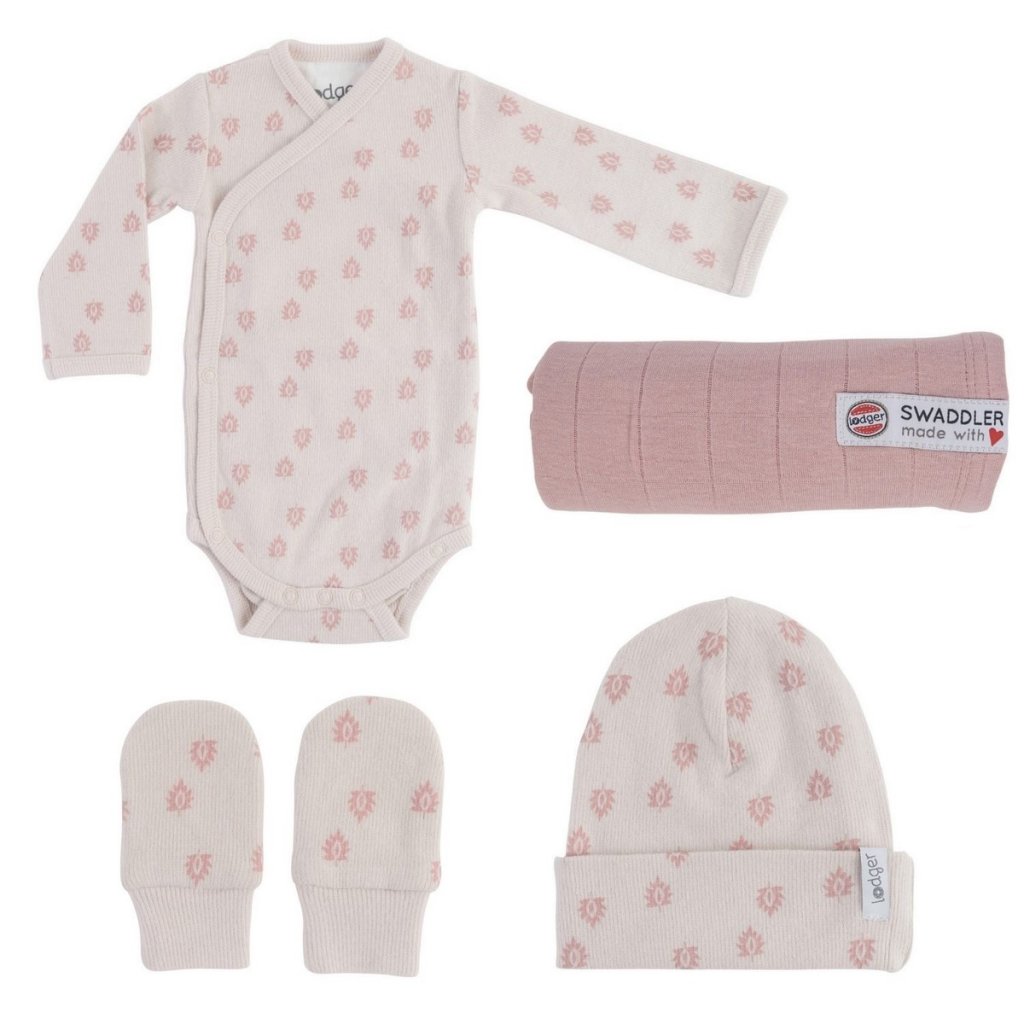 Krásný novorezenecký set. Set se skládá z Beanie Print Rib 0-6 měsíců, Romper LS Rib vel. 56, Mittens Print Rib a Swaddler. Ideální jako dárek k narození miminka! Set má světle růžovou barvu + swaddler v barvě Sensitive.