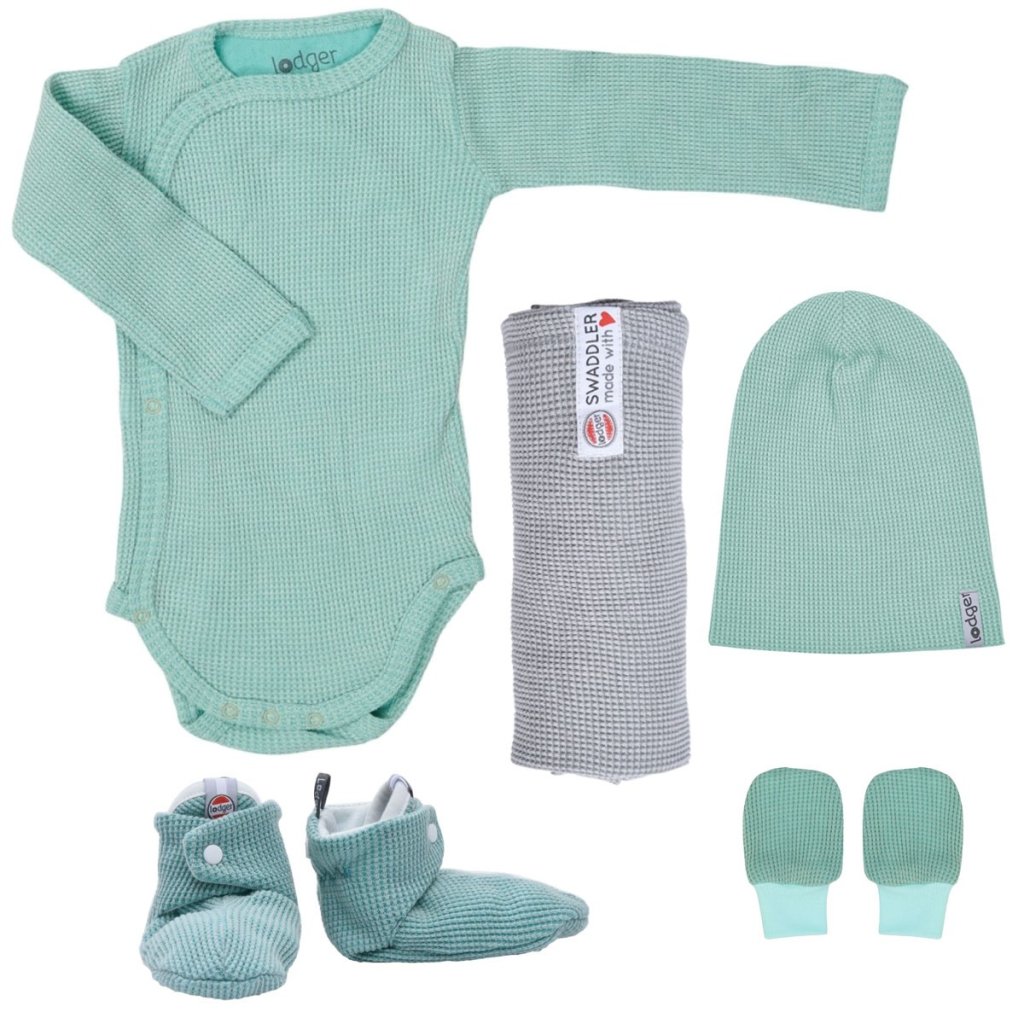 Krásný novorezenecký set. Set se skládá z Beanie Ciumbelle 0-6 měsíců, Romper LS Ciumbelle 56, Slipper Ciumbelle 0-3 měsíce, Swaddler Ciumbelle a Mittens. Ideální jako dárek k narození miminka! Set má světle zelenou barvu + swaddler v barvě Donkey.