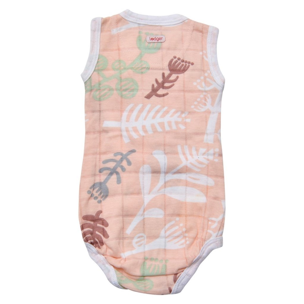 Romper je vyroben ze 100% hydrofilní bavlny, díky čemuž je skvěle savý, prodyšný a opravdu jemný. Má skvělý střih, který dítě neškrtí kolem krku, hrudníku ani ručiček. Kolem nožiček má dodatečné záhyby, a tak nabízí více prostoru pro plenku. Díky zavinovacímu střihu a zapínání na druky se snadno obléká a svléká. Toto body má růžovou barvu s potiskem rostlin.