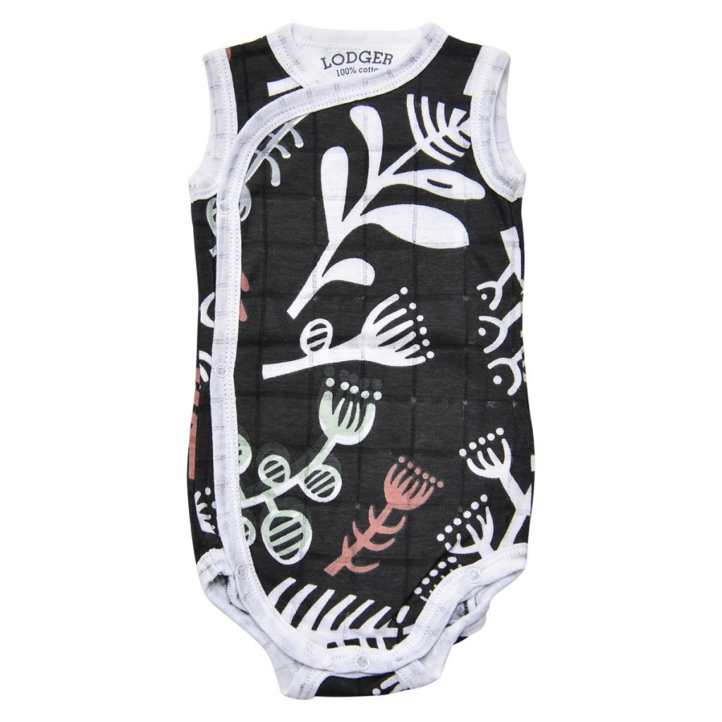 Romper je vyroben ze 100% hydrofilní bavlny, díky čemuž je skvěle savý, prodyšný a opravdu jemný. Má skvělý střih, který dítě neškrtí kolem krku, hrudníku ani ručiček. Kolem nožiček má dodatečné záhyby, a tak nabízí více prostoru pro plenku. Díky zavinovacímu střihu a zapínání na druky se snadno obléká a svléká. Toto body má černou barvu s potiskem rostlin.