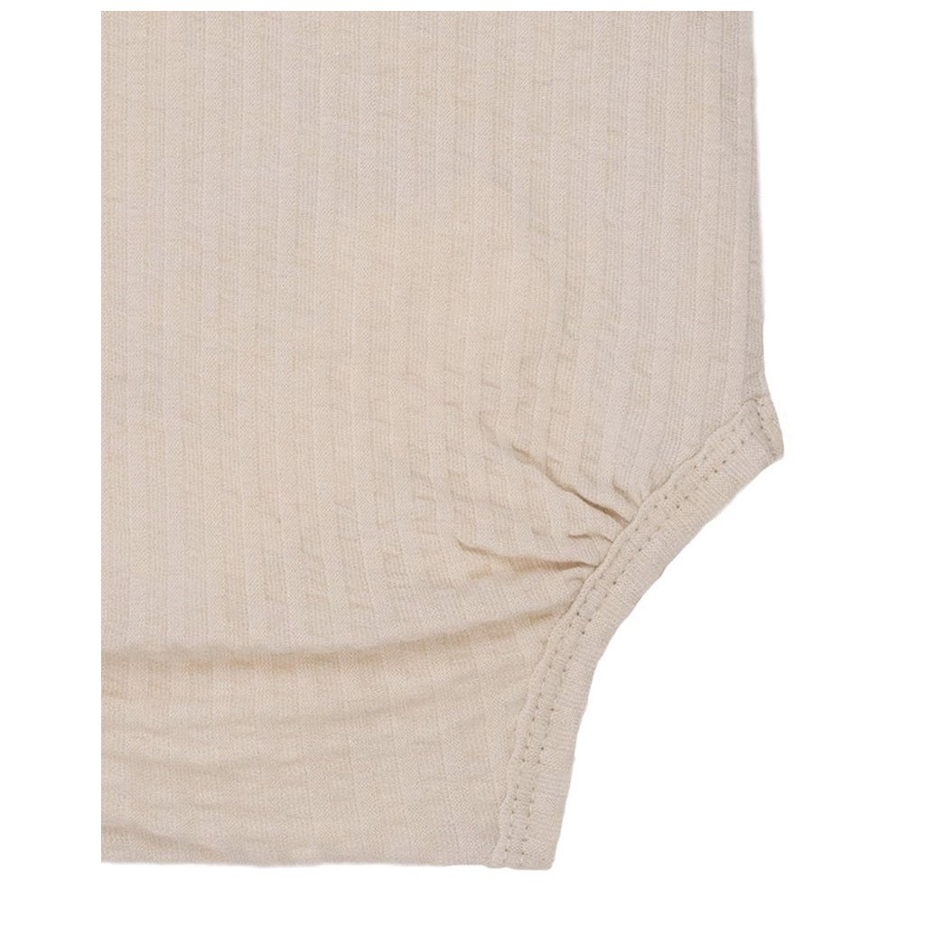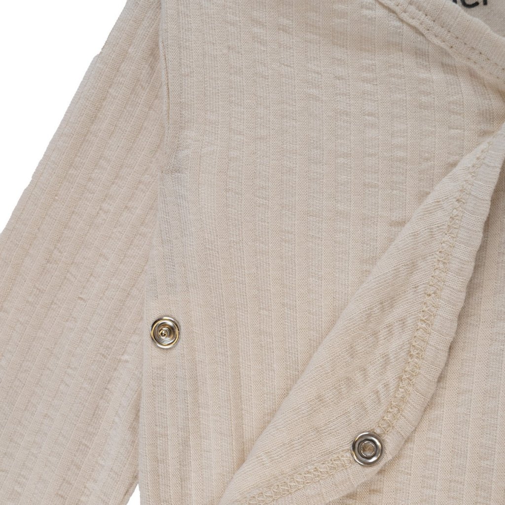 Body Romper je vyrobeno ze 100% bavlny se strukturou Seersucker, díky které je krásně prodyšné a vzdušné. Má skvělý střih, který dítě neškrtí kolem krku, hrudníku ani ručiček. Kolem nožiček má dodatečné záhyby, a tak nabízí více prostoru pro plenku. Díky zavinovacímu střihu a zapínání na druky se snadno obléká a svléká. Díky zvrásněným pruhům má body mačkaný vzhled.