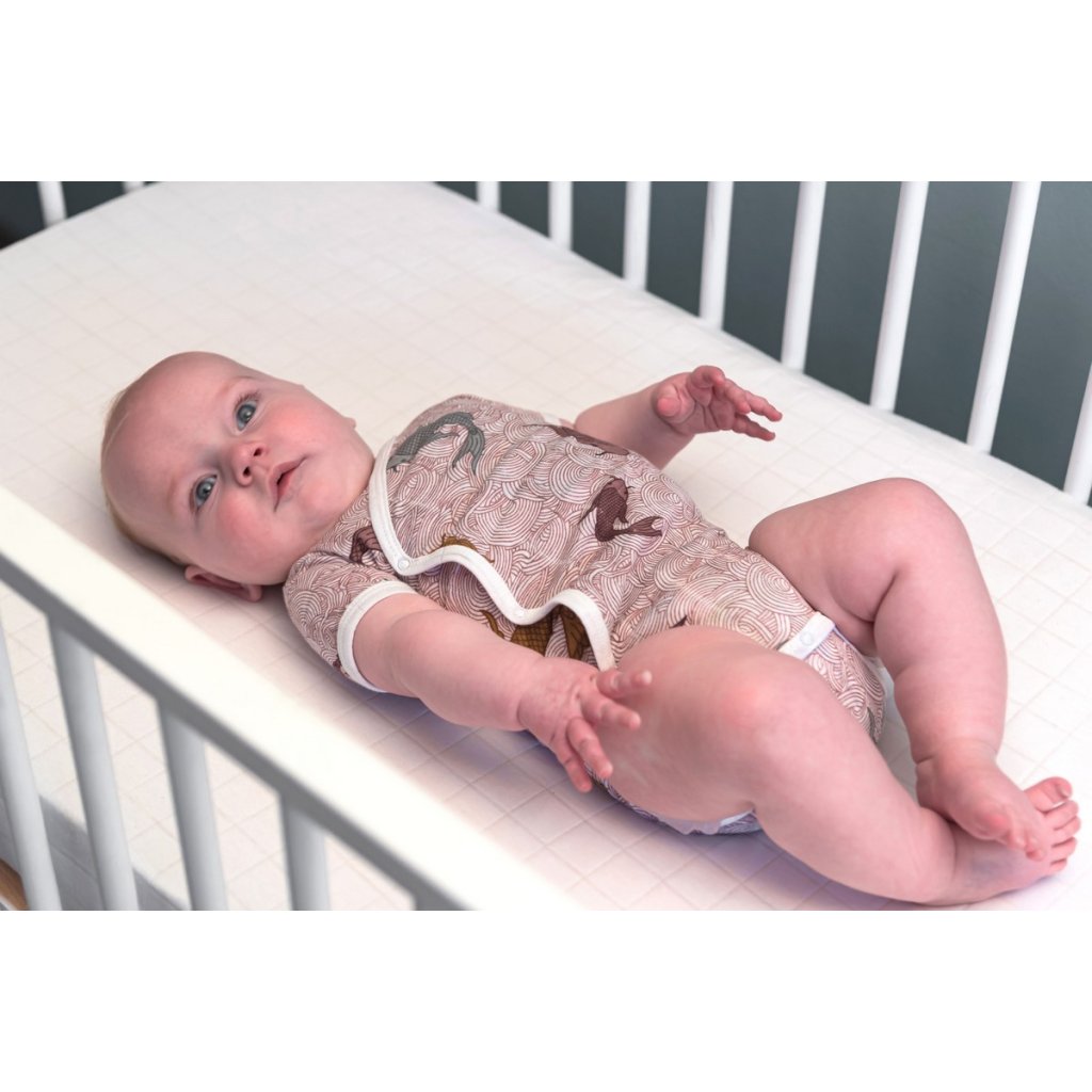 Body Romper je vyrobeno ze 100% prodyšné bavlny, díky které je krásně savé, prodyšné a opravdu jemné. Má skvělý střih, který dítě neškrtí kolem krku, hrudníku ani ručiček. Kolem nožiček má dodatečné záhyby, a tak nabízí více prostoru pro plenku. Díky zavinovacímu střihu a zapínání na druky se snadno obléká a svléká. Ideální kousek na jaro a léto!