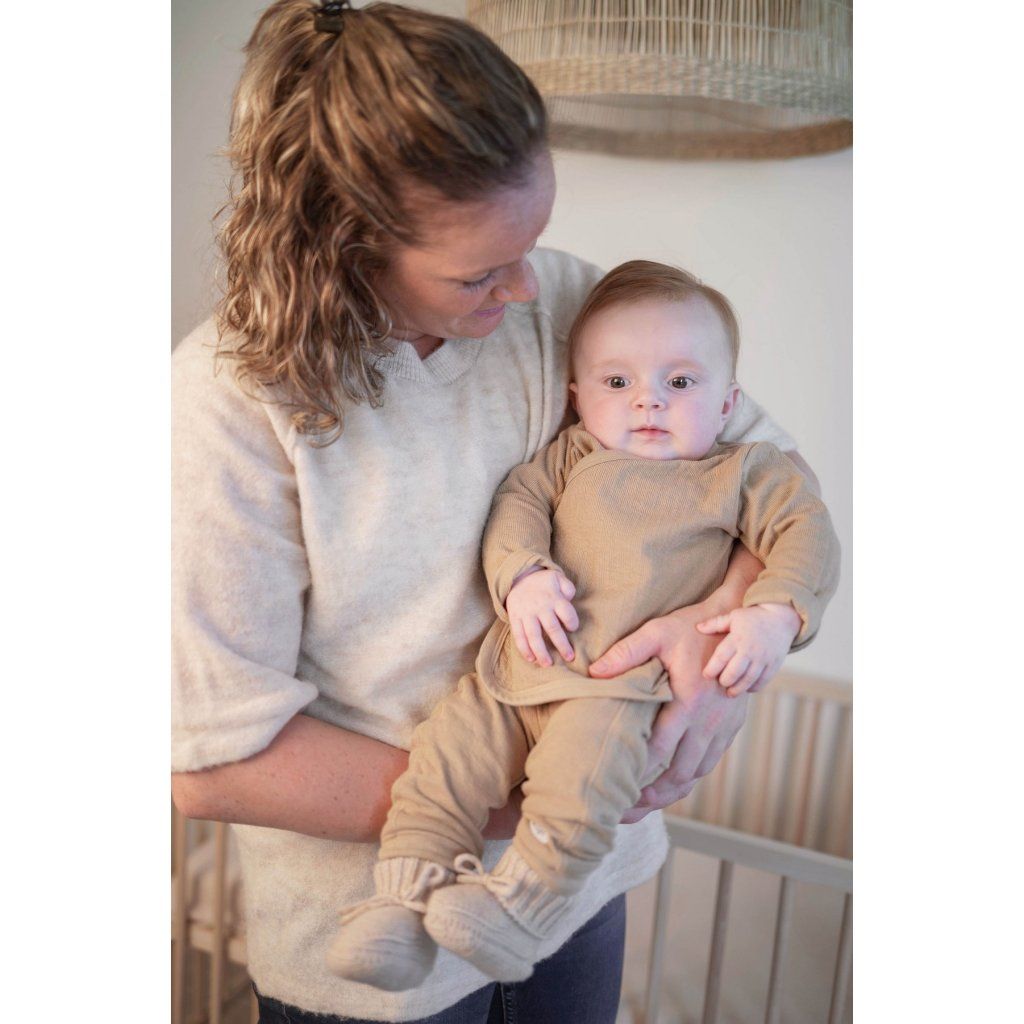 Kabátek je vyroben ze 100% bavlny s žebrovanou strukturou na vnější straně a hladkou úpravou na vnitřní straně. Kabátek je krásně savý, prodyšný a opravdu jemný. Má skvělý střih, který dítě neškrtí kolem krku, hrudníku ani ručiček. Díky praktickému zavinovacímu designu se snadno obléká a svléká. Kabátek má uvnitř druk a zvenku má zavazování na tkaničku.