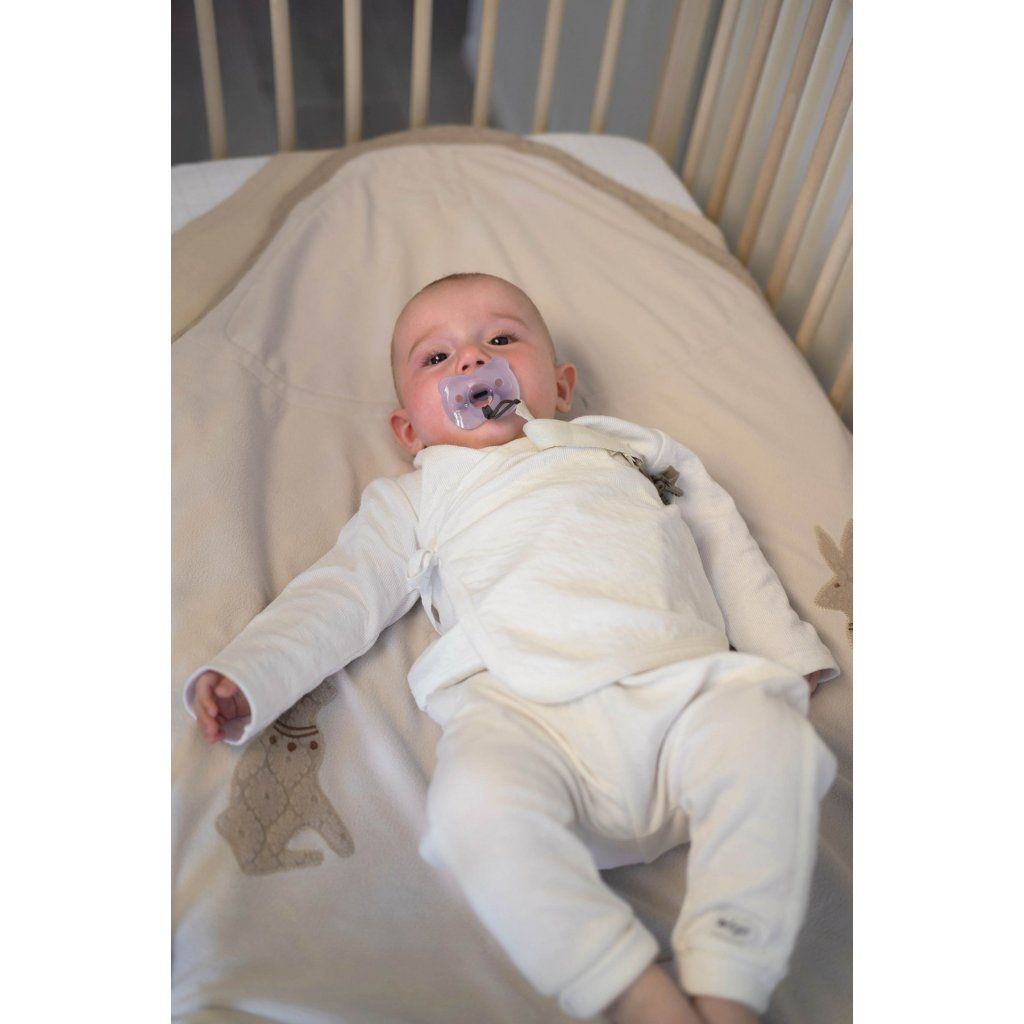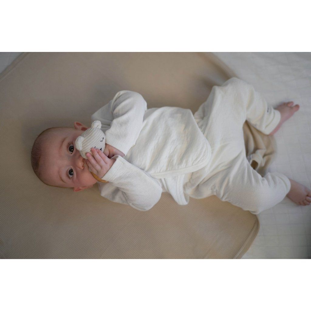 Kabátek je vyroben ze 100% bavlny s žebrovanou strukturou na vnější straně a hladkou úpravou na vnitřní straně. Kabátek je krásně savý, prodyšný a opravdu jemný. Má skvělý střih, který dítě neškrtí kolem krku, hrudníku ani ručiček. Díky praktickému zavinovacímu designu se snadno obléká a svléká. Kabátek má uvnitř druk a zvenku má zavazování na tkaničku.