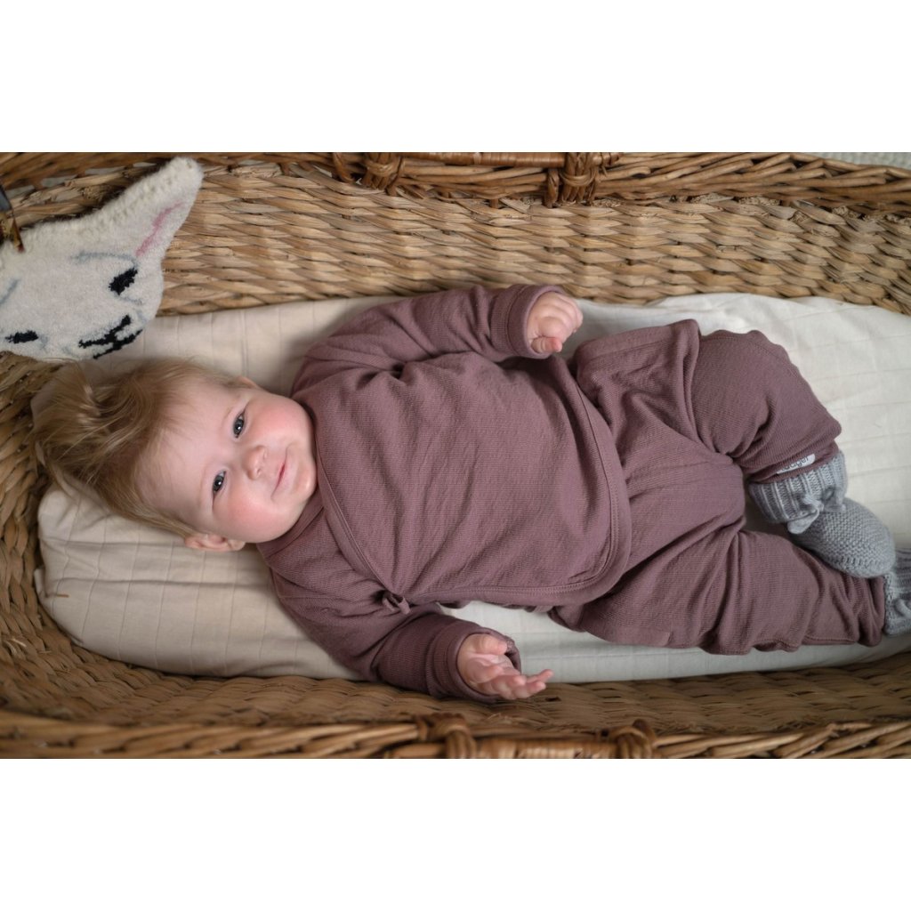 Kabátek je vyroben ze 100% bavlny s žebrovanou strukturou na vnější straně a hladkou úpravou na vnitřní straně. Kabátek je krásně savý, prodyšný a opravdu jemný. Má skvělý střih, který dítě neškrtí kolem krku, hrudníku ani ručiček. Díky praktickému zavinovacímu designu se snadno obléká a svléká. Kabátek má uvnitř druk a zvenku má zavazování na tkaničku.