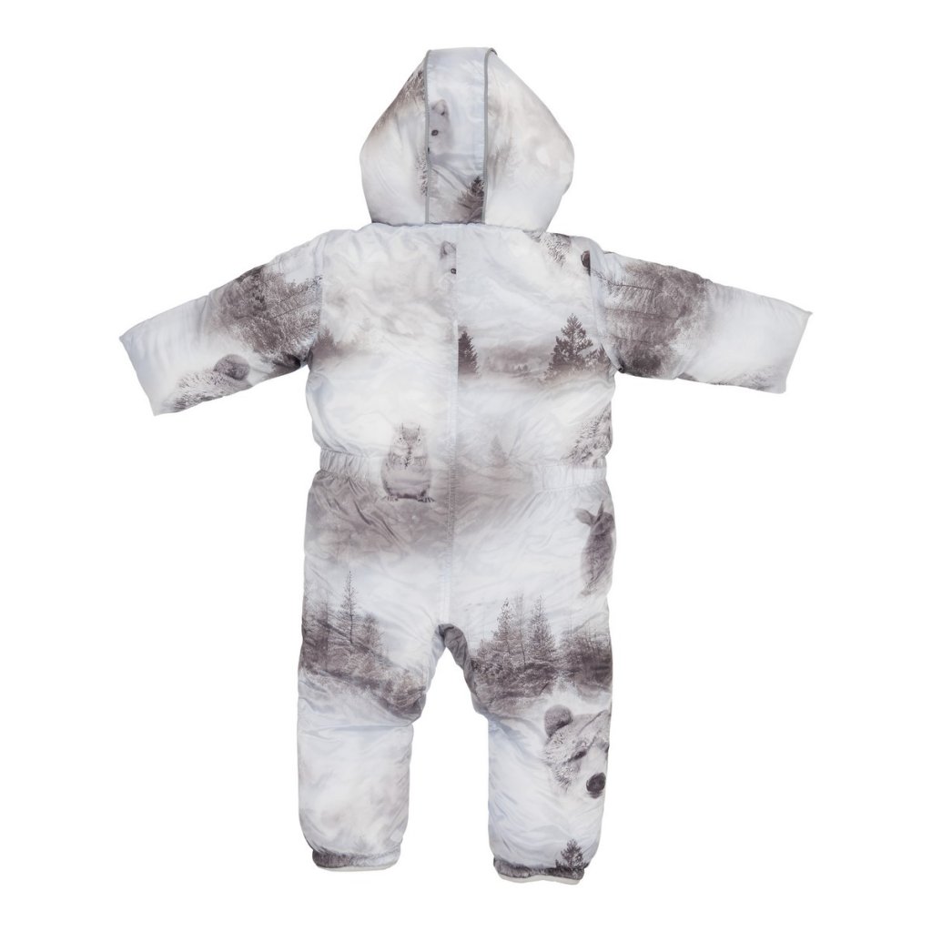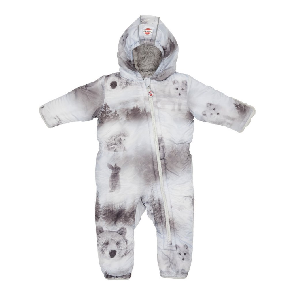 Zimní kombinéza Skier nizozemské značky Lodger je vyrobena z pevného, vodě i větru odolného polyesteru tak, aby miminko ochránila i za opravdu nepříznivého počasí. Podšívka je ušita z měkkého fleecu, který je příjemný na dotek a nedráždí dětskou pokožku. Kombinéza má tmavě šedobílou barvu s motivem lesních zvířat typickým pro kolekci Botanimal.