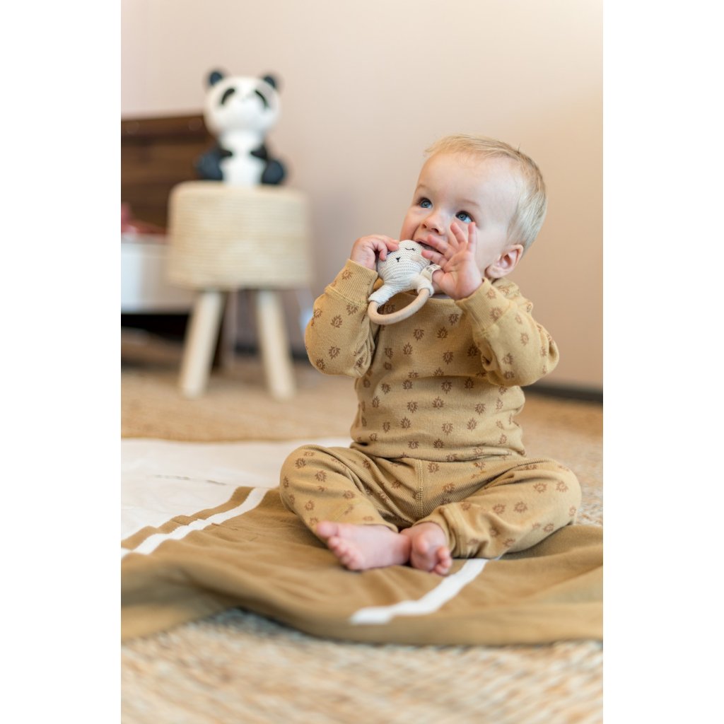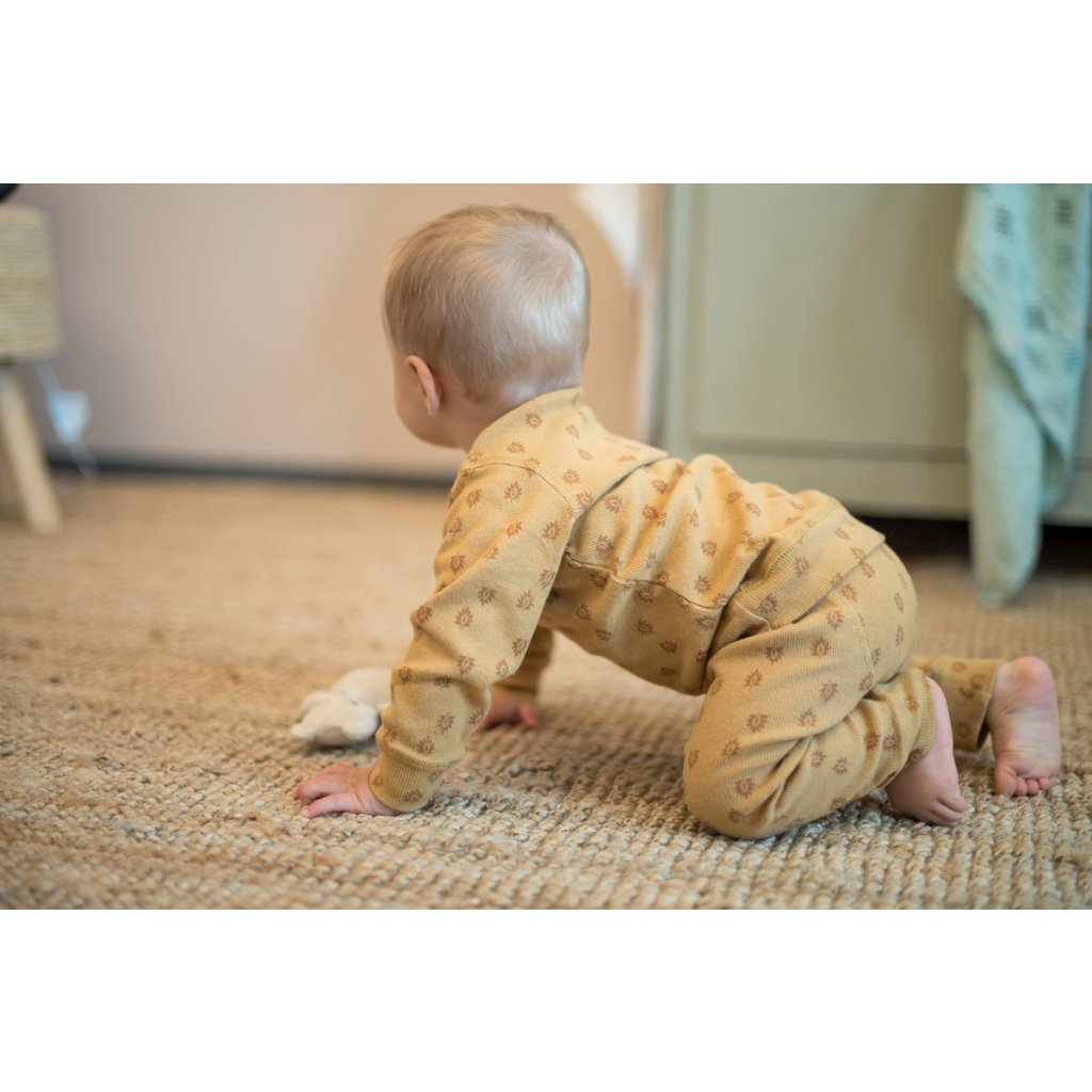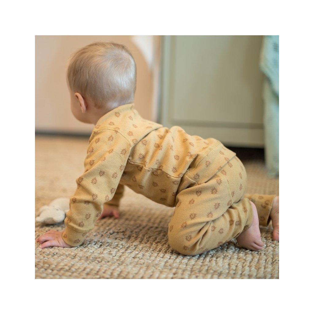 Dvoudílné dětské pyžámko vyrobené ze 100% bavlny. Rukávy a nohavice jsou zakončeny měkkým bavlněným úpletem. Spodní díl má dodatečné záhyby pro plenku, díky čemuž skvěle sedne. Pyžámko má certifikát Oeko-Tex, a proto neobsahuje žádné škodlivé látky. Spolu s Hopperem ve stejné barvě je ideálním dárkem! Barva je hořčicová s potiskem.