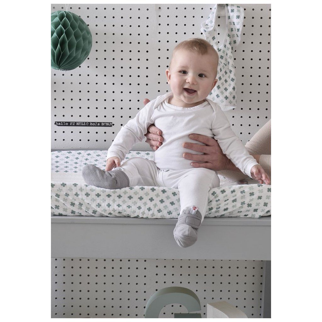 Tyto capáčky z kolekce Quilt jsou ideální obuví pro miminka do jarních a letních měsíců. Jsou totiž vyrobeny ze 100% bavlny, která nejen že je krásně měkoučká a citlivá k dětské pokožce, ale také skvěle prodyšná. Capáčky mají nastavitelný suchý zip, díky kterému se dokonale přizpůsobí dětské nožičce a snadno se nazouvají. Ve velikosti 6 - 12 měsíců je jejich spodní strana opatřena speciální protiskluzovou úpravou. Capáčky mají béžovou barvu, která je doplněna o podšívku s šedými a béžovými obláčky.