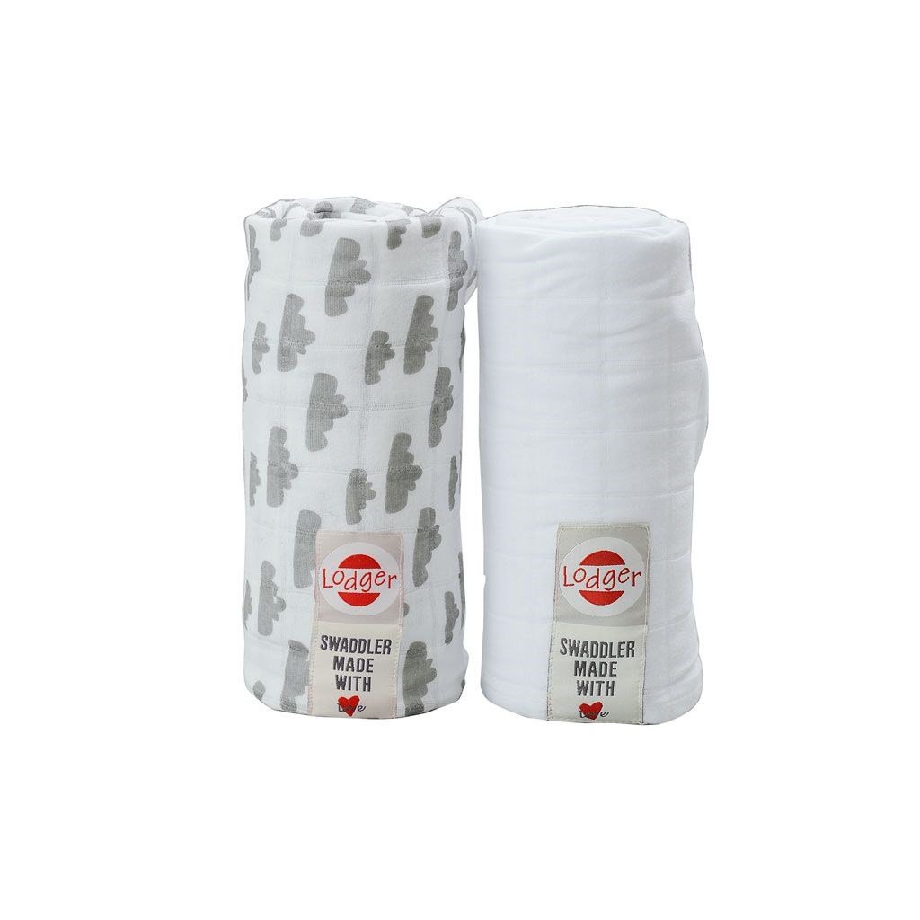 Swaddler od firmy Lodger je základním produktem každé novorozenecké výbavičky. Má totiž velmi širokou škálu použití, která jsou uvedena níže. Swaddler je vyroben z hydrofilní bavlněné látky, která je, na rozdíl od ostatních na trhu, pletená, nikoli tkaná. Díky tomu je schopna absorbovat více vlhkosti a navíc je silnější a odolnější. Kromě toho je pletená hydrofilní látka velice měkká, pružná, prodyšná a příjemná na dotek. Jeden Swaddler má moderní vzor šedých obláčků a druhý je čistě bílý.