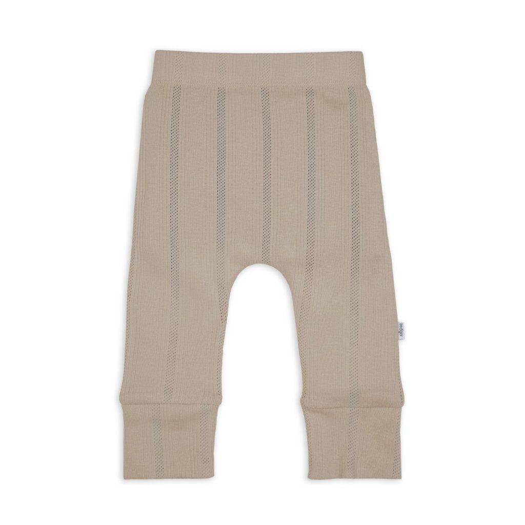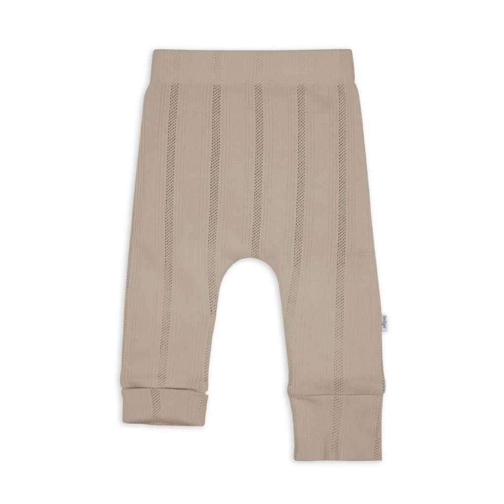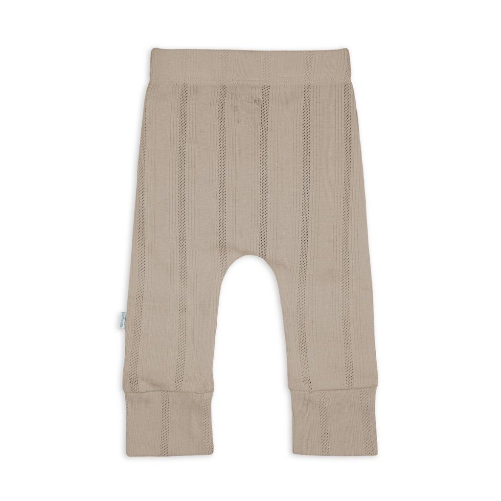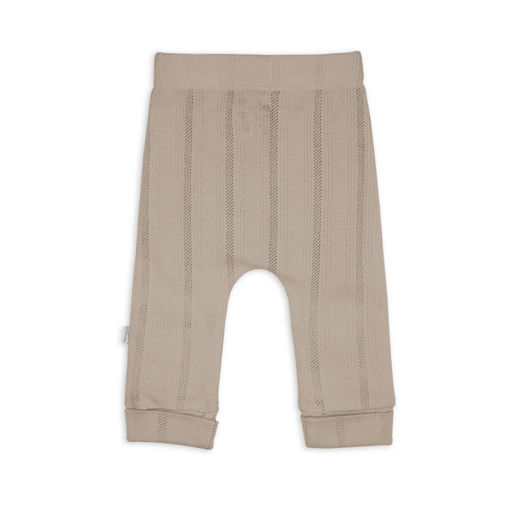 Tepláčky s elastickým pasem. Příjemný, prodyšný materiál je šetrný k citlivé dětské pokožce. Tepláčky mají nízký sed, takže nebudou vaše miminko nikde tlačit nebo škrtit a nabízejí tak více prostoru pro plenku. Můžete je zkombinovat se zavinovacími kabátky a vytvořit tak stylový outfit na podzim a jaro. Pointelle úplet dodává tepláčkům jemný, moderní a nadčasový vzhled.