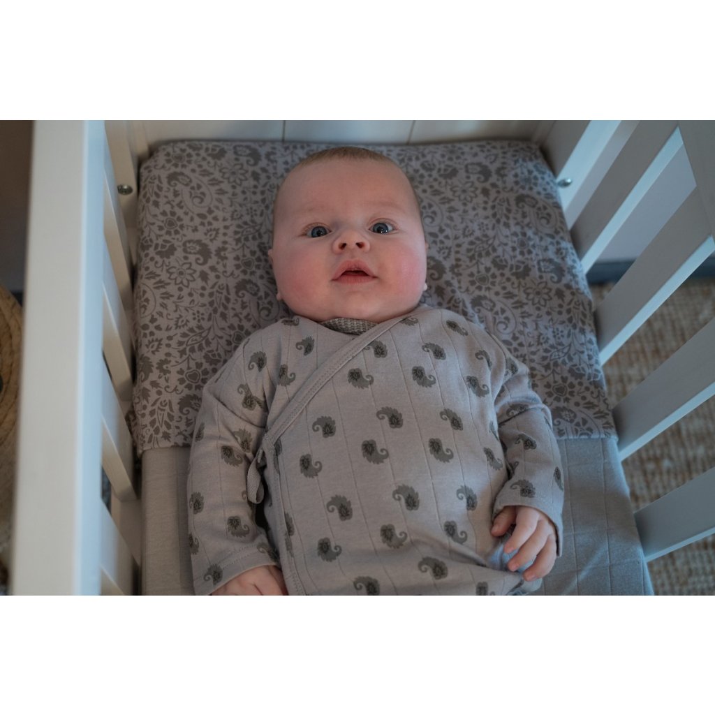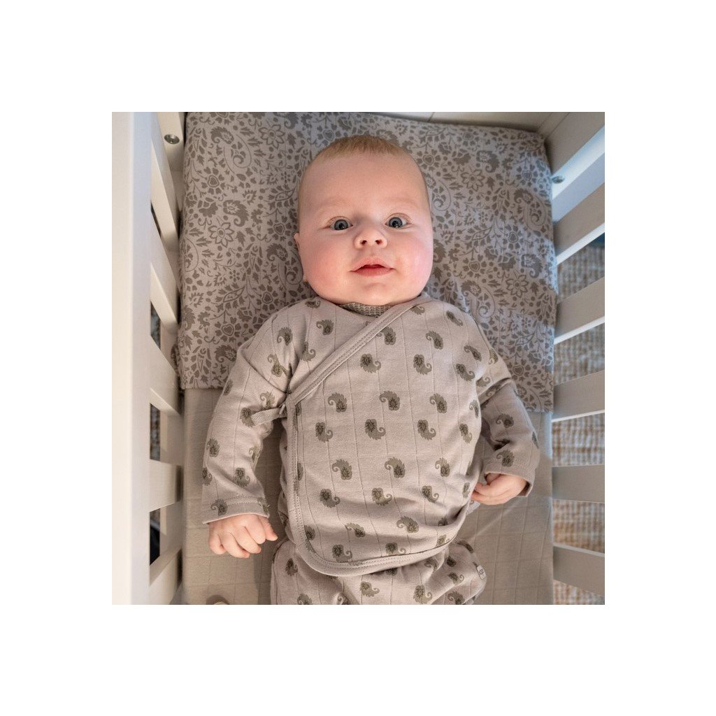 Kabátek je vyroben ze 100% bavlny, díky které je krásně savý, prodyšný a opravdu jemný. Má skvělý střih, který dítě neškrtí kolem krku, hrudníku ani ručiček. Díky praktickému zavinovacímu designu se snadno obléká a svléká. Kabátek má uvnitř druk a zvenku má zavazování na tkaničku.