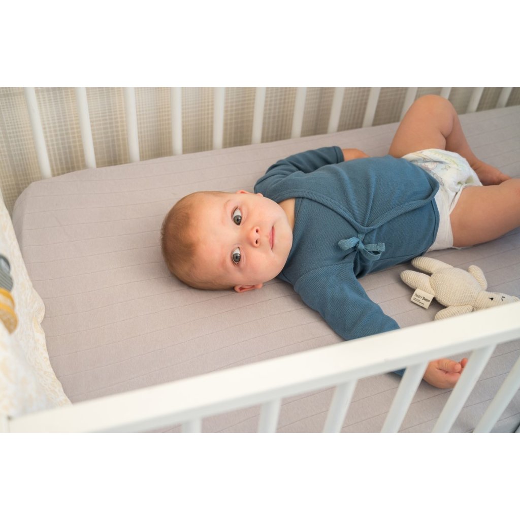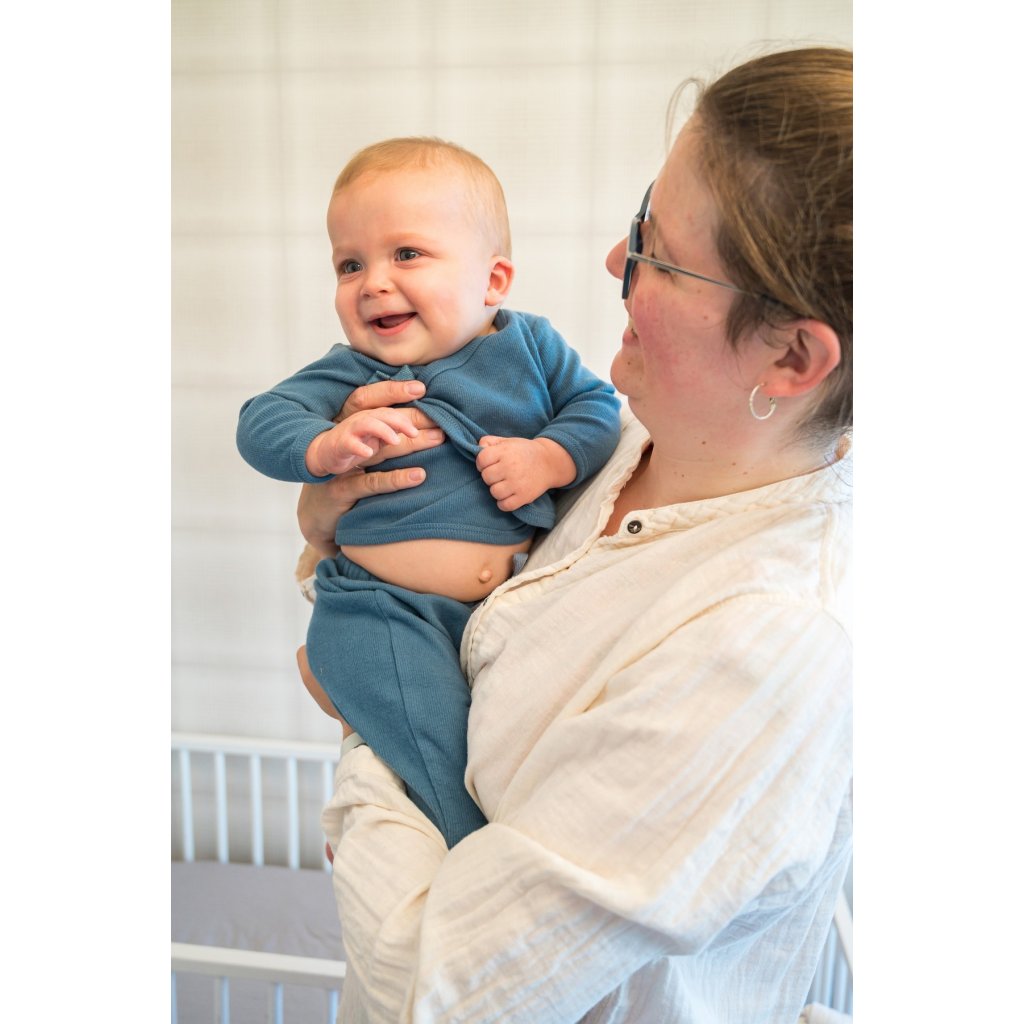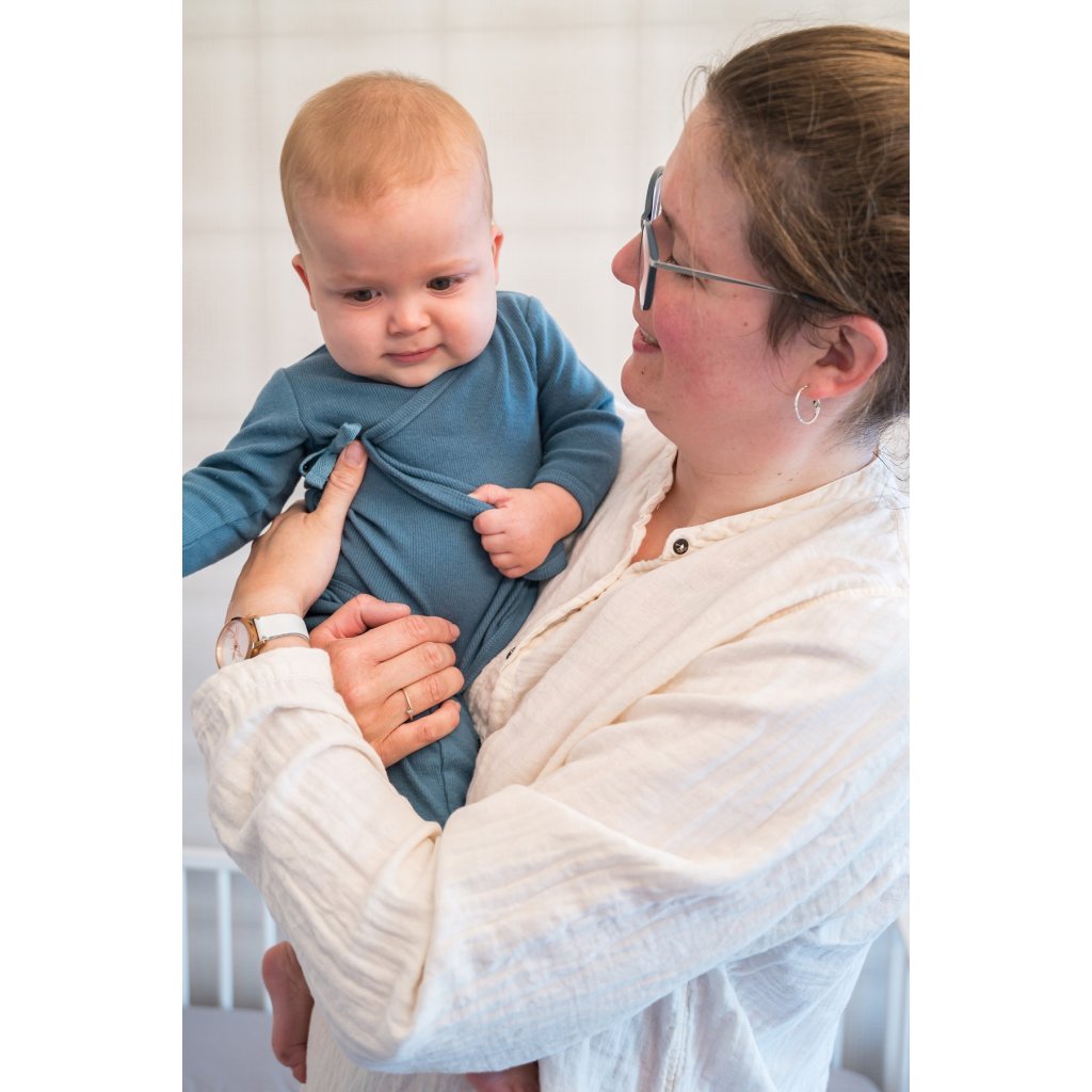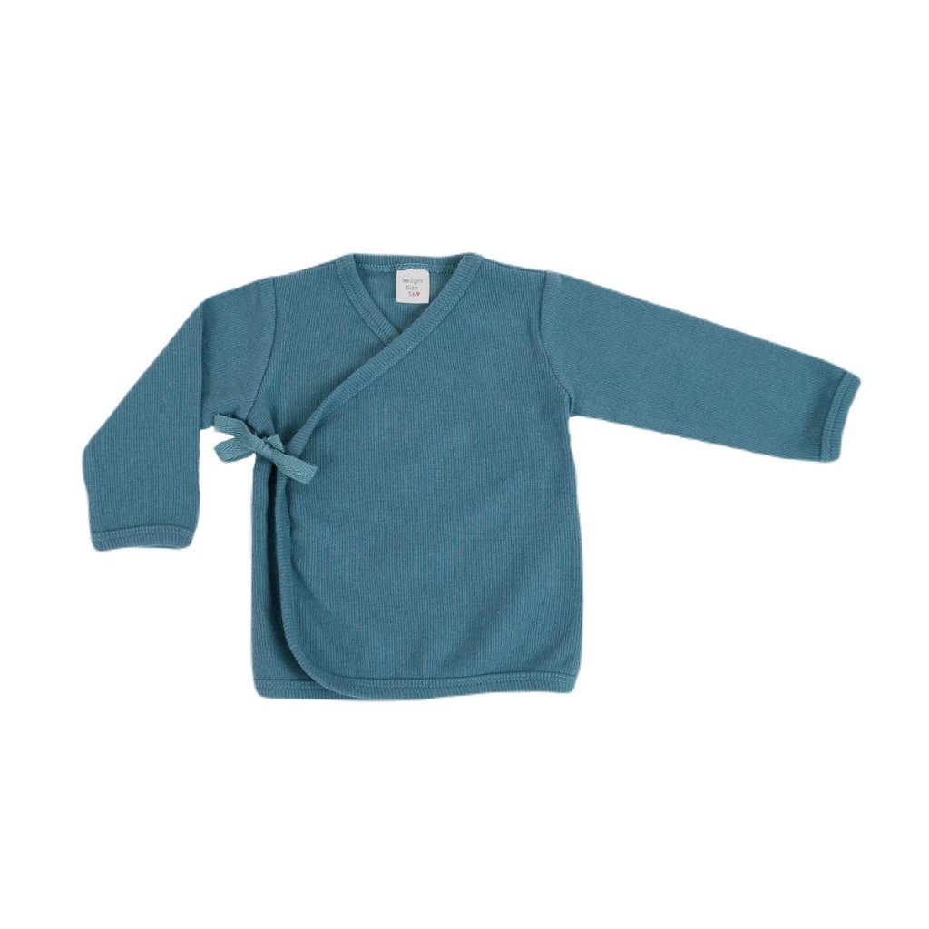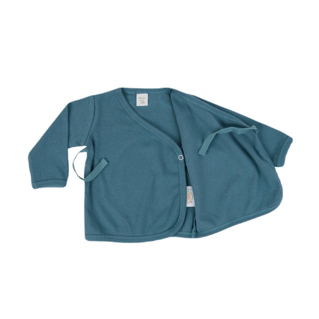 Kabátek je vyroben ze 100% bavlny s žebrovanou strukturou, díky které je krásně savý, prodyšný a opravdu jemný. Má skvělý střih, který dítě neškrtí kolem krku, hrudníku ani ručiček. Díky praktickému zavinovacímu designu se snadno obléká a svléká. Kabátek má uvnitř druk a zvenku má zavazování na tkaničku.