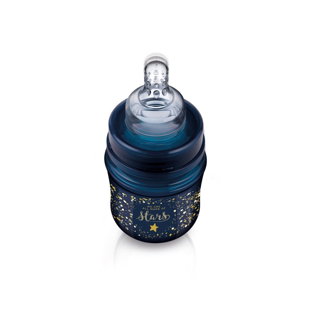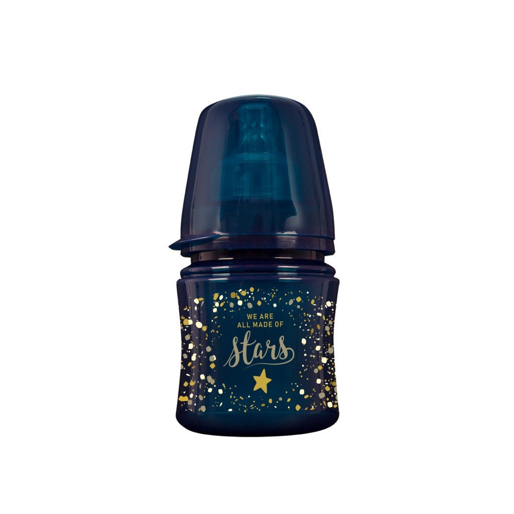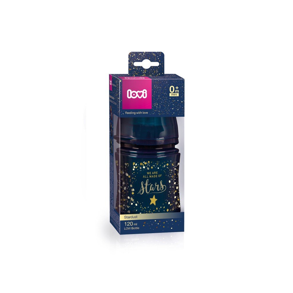 Stardust je tady! Jedinečná, designově nepřehlédnutelná, prémiová kolekce od LOVI. Kolekce se pyšní lehkou lahví o objemu 240 ml s dynamickou silikonovou savičkou LOVI, která povzbuzuje miminko k aktivní činnosti během sání, stejně jako u kojení a nenarušuje tak jeho sací reflex. Lahev neobsahuje BPA. Unikátní design kolekce Stardust - zdobení v podobě zlatého třpytu, který připomíná hvězdné nebe. Barva je tmavě modrá.