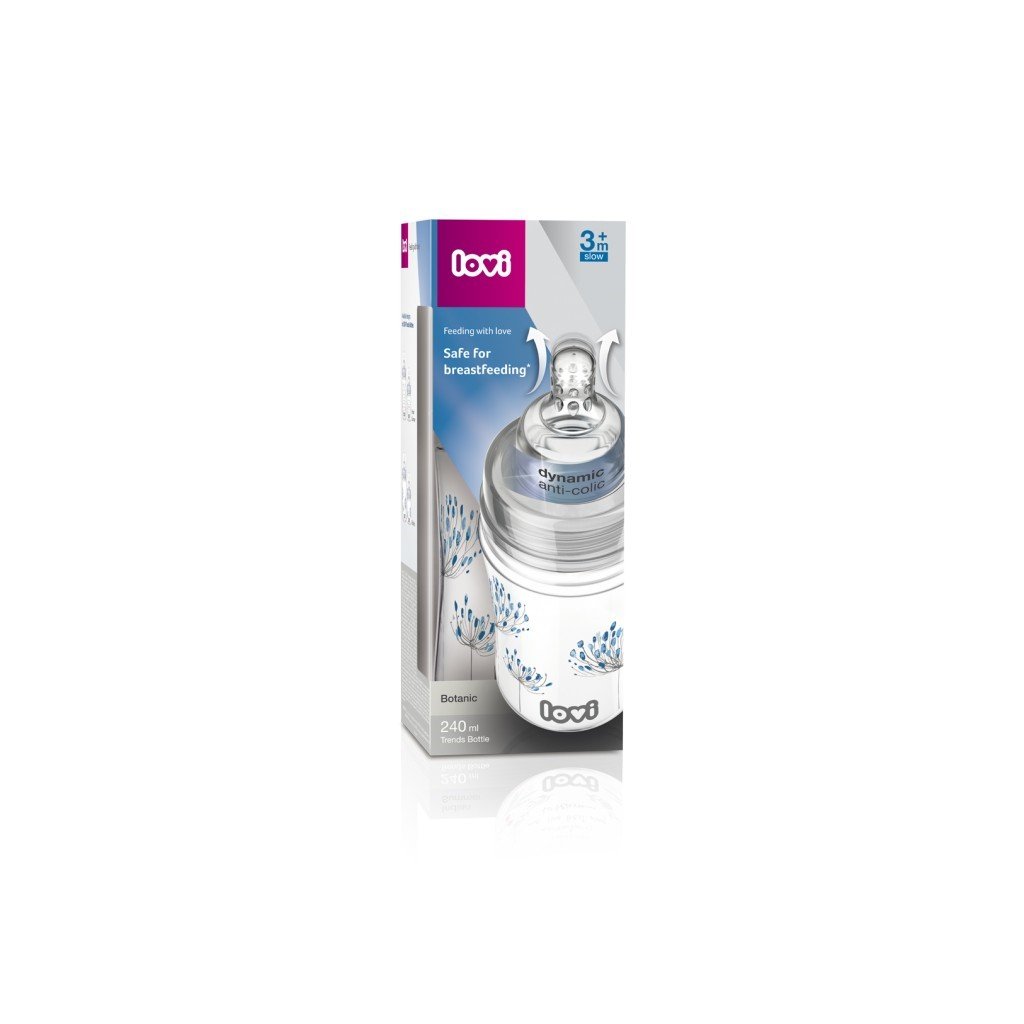 Láhev bezpečná při kojení v novém moderním designu, který sleduje současné trendy. Umožňuje kombinaci krmení z láhve a kojení. Láhev je vybavena dynamickou savičkou LOVI, která při krmení modifikuje svůj tvar – prodlužuje se. Povzbuzuje tak dítě k aktivní činnosti během sání, stejně jako u kojení. Nenarušuje sací reflex. Zachovává přirozený rytmus sání a aktivní práci svalů úst a jazyka. Stimuluje místa, která se podílí na rozvoji mluvy a pozitivně ovlivňuje správný vývoj celé dutiny ústní. Savička obsahuje efektivní systém odvzdušňování SUPER Vent, který zabraňuje vzniku podtlaku a minimalizuje polykaný vzduch, který bývá příčinou vzniku dětské koliky. Umožňuje správnou koordinaci sání – polykání - dýchání. Láhev obsahuje elastický těsnící disk, který z ní vytvoří praktický zásobník na uchovávání pokrmu a víčko s odměrkou.
