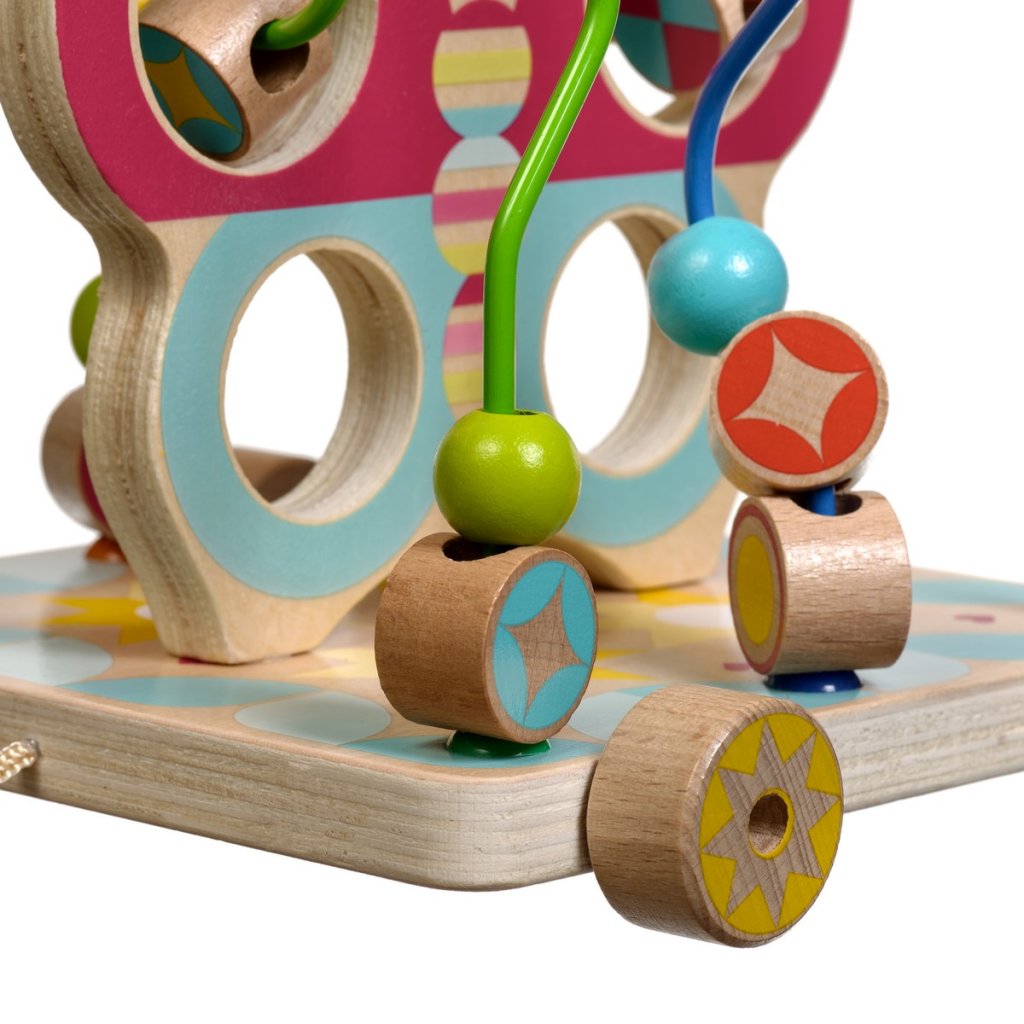 Dřevěný tahací korálkový labyrint s motivem motýla je skvělý pro rozvoj jemné motoriky a prostorového myšlení a zároveň je zábavný a poutavý pro malé děti. Pomáhá jim s jejich prvními krůčky a cvičením rovnováhy. Tahací labyrint na dřevěném podkladu s kolečky je ještě více vzrušující - má 3 kolejnice ohnuté v zakřivených tvarech v různých rovinách a na každé kolejnici jsou dřevěné korálky různých tvarů a barev, kterými dítě pohybuje skrz otvory v křídlech namalovaného motýla. Výška labyrintu včetně podstavce s kolečky 23 cm, délka podstavce labyrintu 20 cm, délka provázku 23 cm, rozměry korálků a tvarů jsou různé.