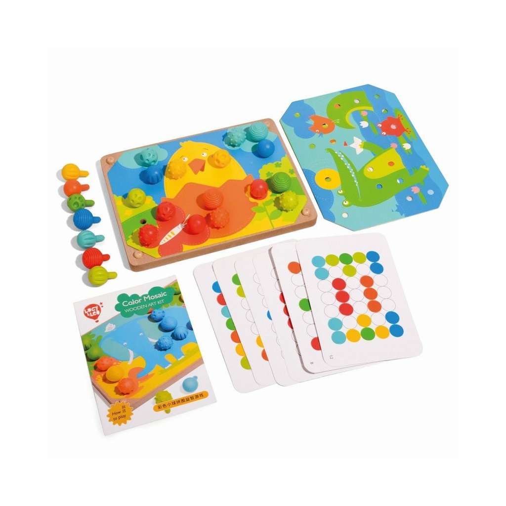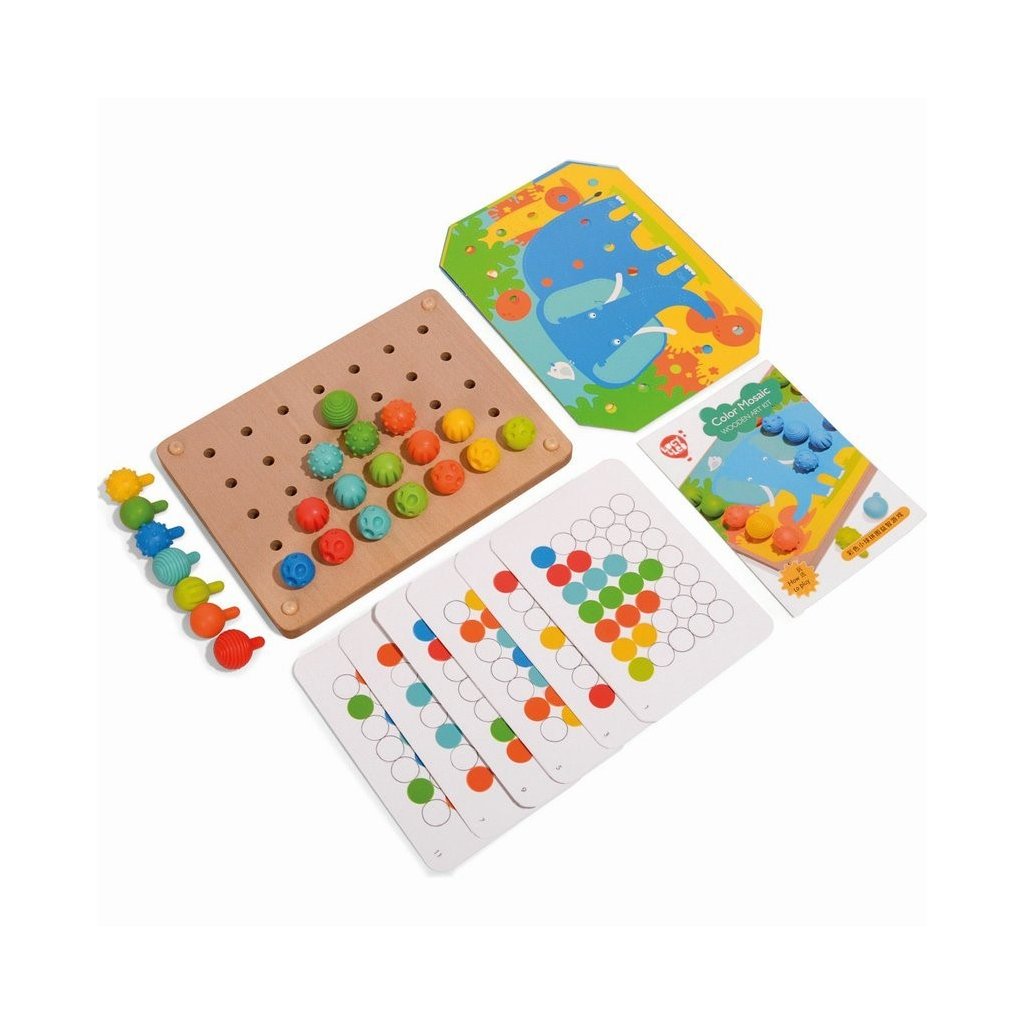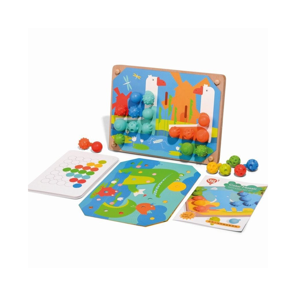 Mozaika a vyšívání je herní set pro děti rozvíjející jemnou motoriku a tvořivé myšlení. Balení obsahuje 35 velkých silikonových kolíčků s odlišně strukturovaným povrchem v 7 barvách. Dále obsahuje 12 barevných obrázků se zvířátky a 6 oboustranných předloh, dřevěný podstavec s otvory na kolíčky a 4 barevné tkaničky k vyšívání. Dítě si vybere jednu z barevných předloh, položí na dřevěný podstavec a začne obrázek vyplňovat barevnými kolíčky. Starší děti mohou skládat podle oboustranných předloh, které se na podstavec už nepřikládají. Pokud děti mají chuť, mohou barevnými tkaničkami také vyšívat. Tato hračka je označována jako Montessori pomůcka.
