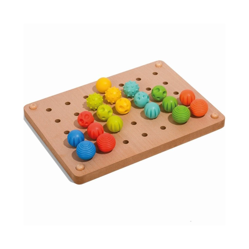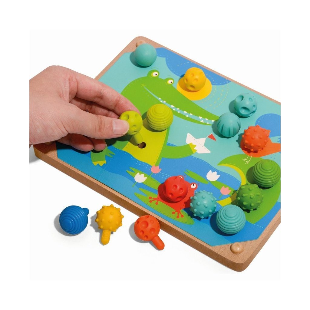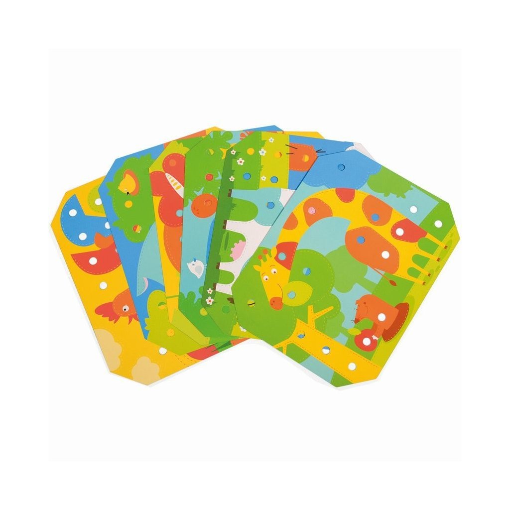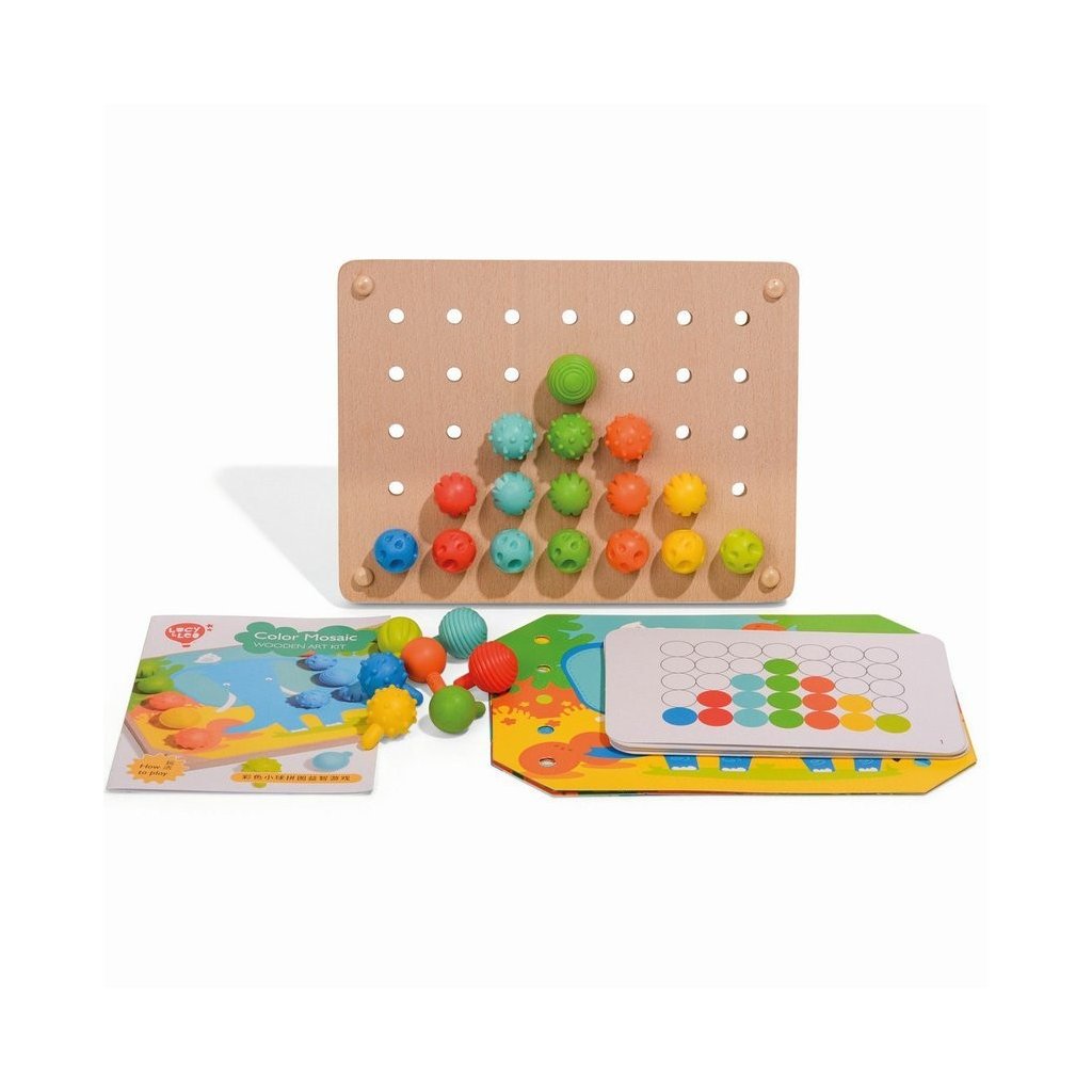 Mozaika a vyšívání je herní set pro děti rozvíjející jemnou motoriku a tvořivé myšlení. Balení obsahuje 35 velkých silikonových kolíčků s odlišně strukturovaným povrchem v 7 barvách. Dále obsahuje 12 barevných obrázků se zvířátky a 6 oboustranných předloh, dřevěný podstavec s otvory na kolíčky a 4 barevné tkaničky k vyšívání. Dítě si vybere jednu z barevných předloh, položí na dřevěný podstavec a začne obrázek vyplňovat barevnými kolíčky. Starší děti mohou skládat podle oboustranných předloh, které se na podstavec už nepřikládají. Pokud děti mají chuť, mohou barevnými tkaničkami také vyšívat. Tato hračka je označována jako Montessori pomůcka.