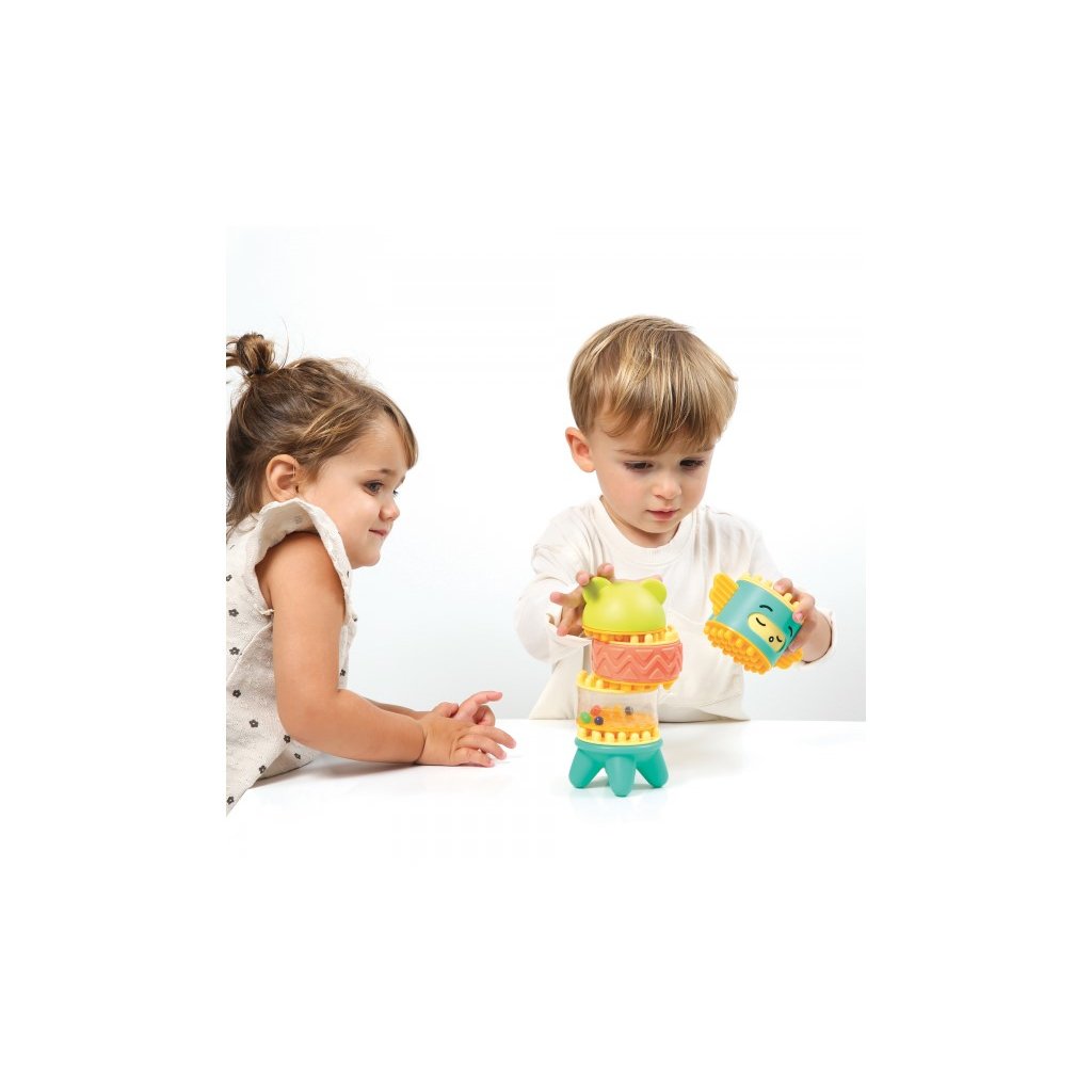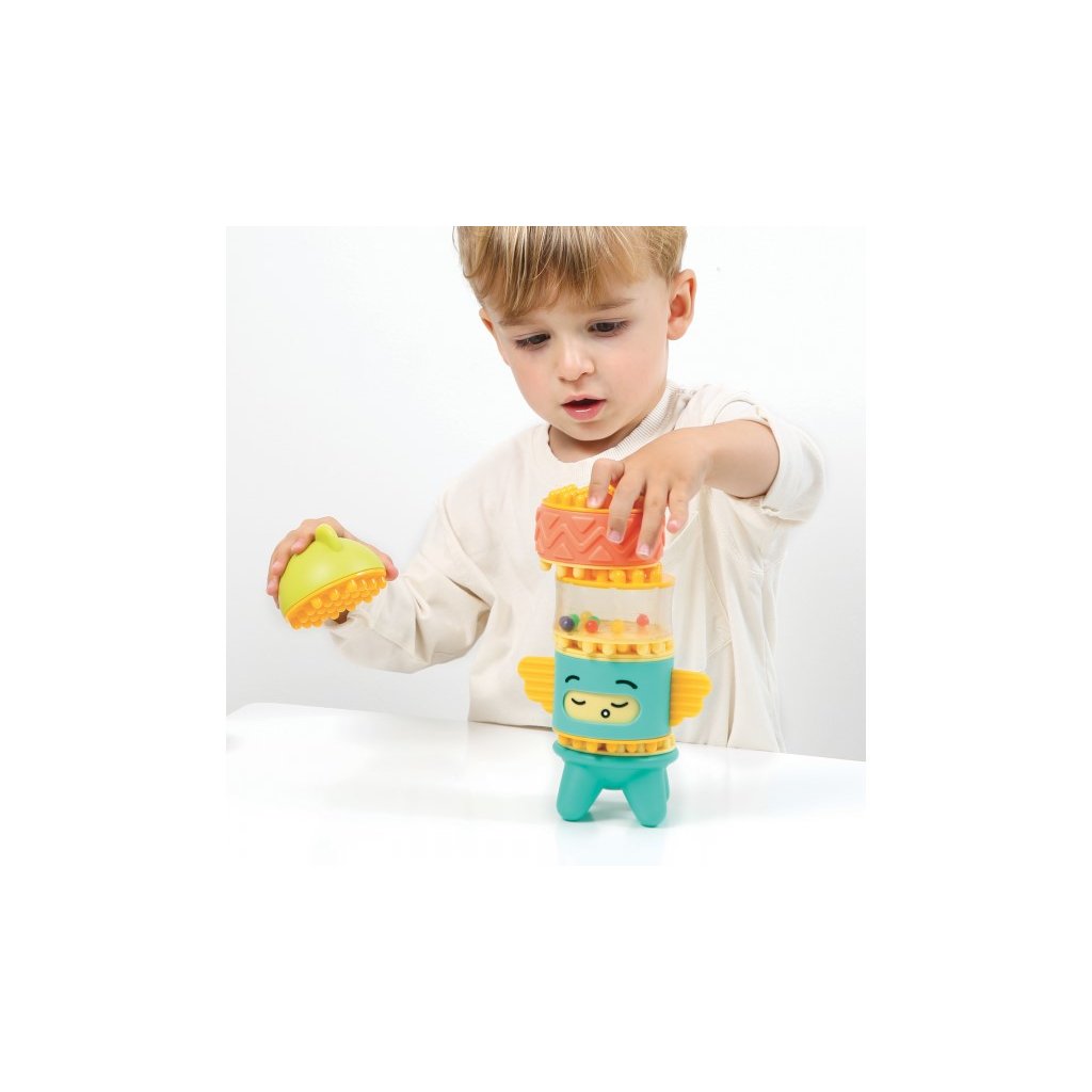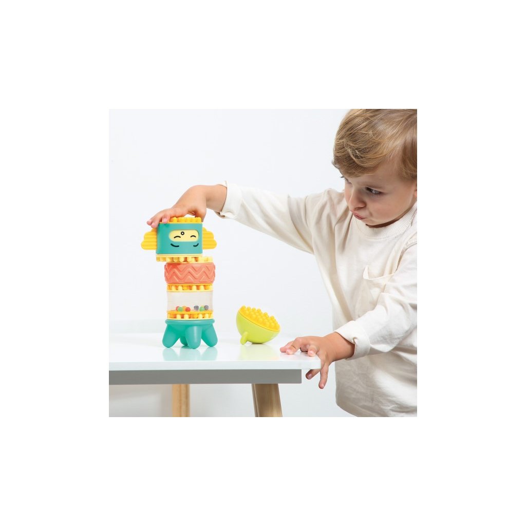 Stavebnice pro nejmenší se skládá se 6 dílů, které dítě skládá na sebe, až vytvoří figurku podobnou totemu. Spící obličejík na jednom z dílů se po zmáčknutí hlavy "probudí" a změní se na obličejík usměvavý. Díly je možné na sebe skládat pokaždé v jiném pořadí a vytvářet tak různé varianty věže. Stavebnice vede děti intuitivně k jednoduchým pohybům, které jsou klíčové pro rozvoj jemné motoriky: skládání, válení, spojování atd. Děti si procvičují úchop, prostorové vnímání, soustředění, a trpělivost při skládání dílků. Stavebnice je vyrobena z materiálu příjemného na dotek. Vhodné pro děti od 10 měsíců.