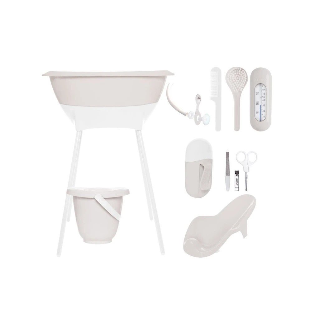 Máte rádi krásné moderní věci a nechcete za ně utratit příliš mnoho peněz? Tak si vyberte LUMU. Sada všech výrobků trendové holandské značky LUMA babycare, které budete ke koupání potřebovat sestává z dětské plastové vaničky, stojanu pod vaničku , kyblíku na pleny s víkem, koupacího lehátka, koupacího teploměru, hřebínku a kartáčku, dětské manikúry a odtokové hadice. Cena sady je zvýhodněná oproti koupi po jednotlivých kusech!