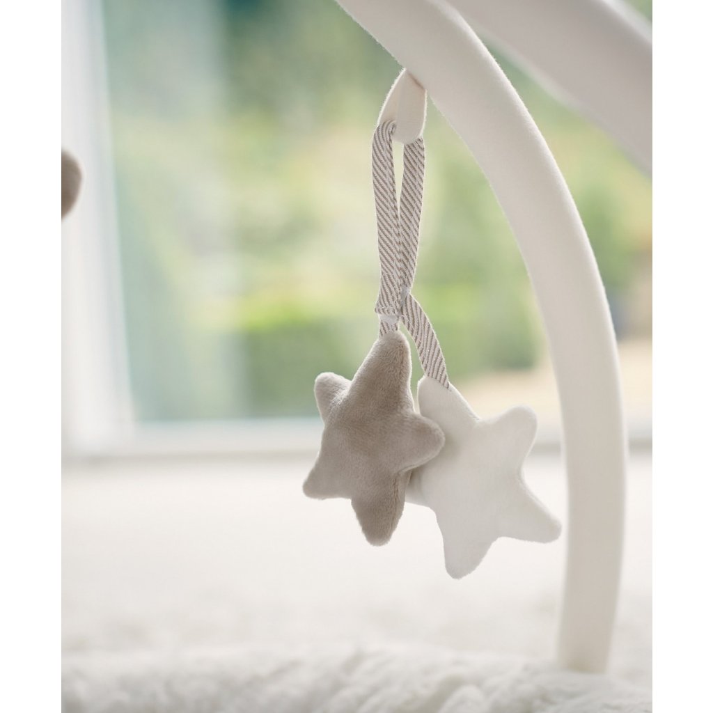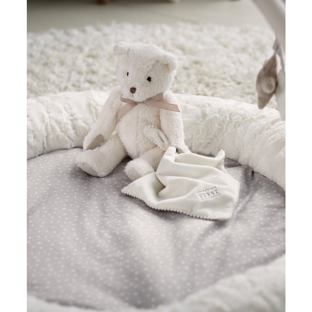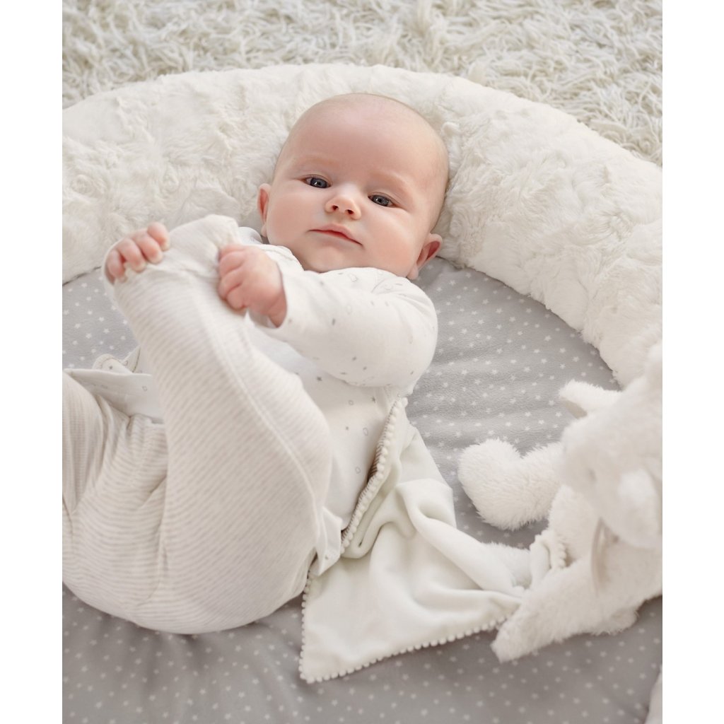 Hrací deka ve tvaru útulného hnízdečka je ideální pro miminko v chladných obdobích roku. Měkké vyvýšené okraje deky pokryté hebkým plyšem vytvářejí pocit bezpečí pro dítě a současně jej podněcují ke hře na bříšku. Svítící hvězdička a další zavěšené chrasticí či pískací hračky lákají dítě ke zkoumání a pozorování. Kromě zavěšených hraček je součástí hrací deky i velký roztomilý medvídek, který se může stát nepostradatelným společníkem v postýlce dítěte. Odnímatelná hrazda umožňuje používat deku i jednotlivé hračky samostatně.