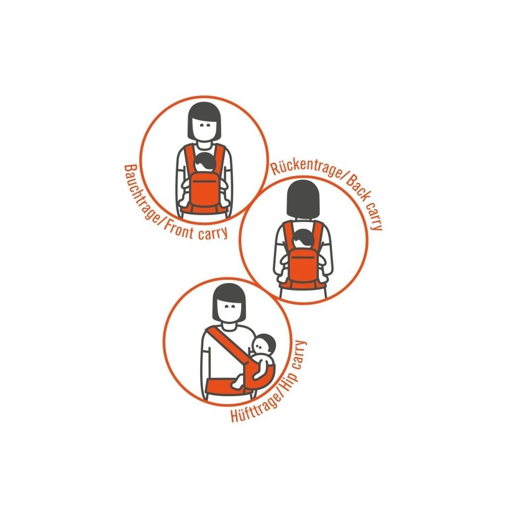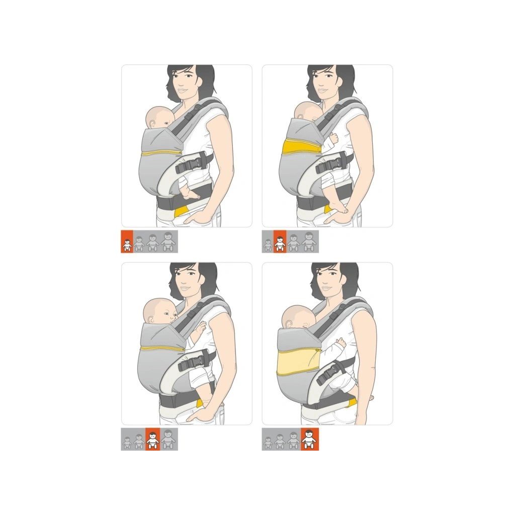 - při nošení na břiše lze popruhy na zádech překřížit pro větší komfort (ocení zejména osoby s úzkými rameny)