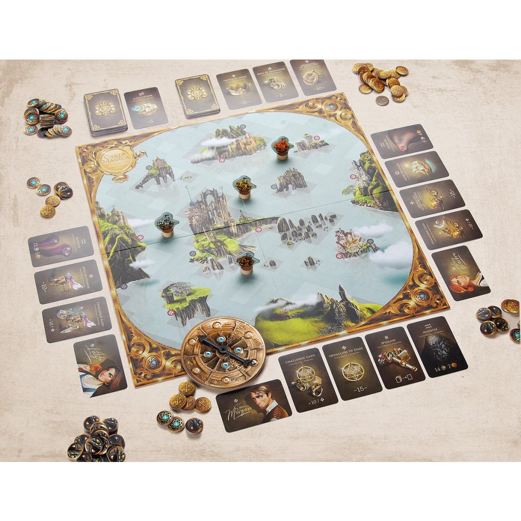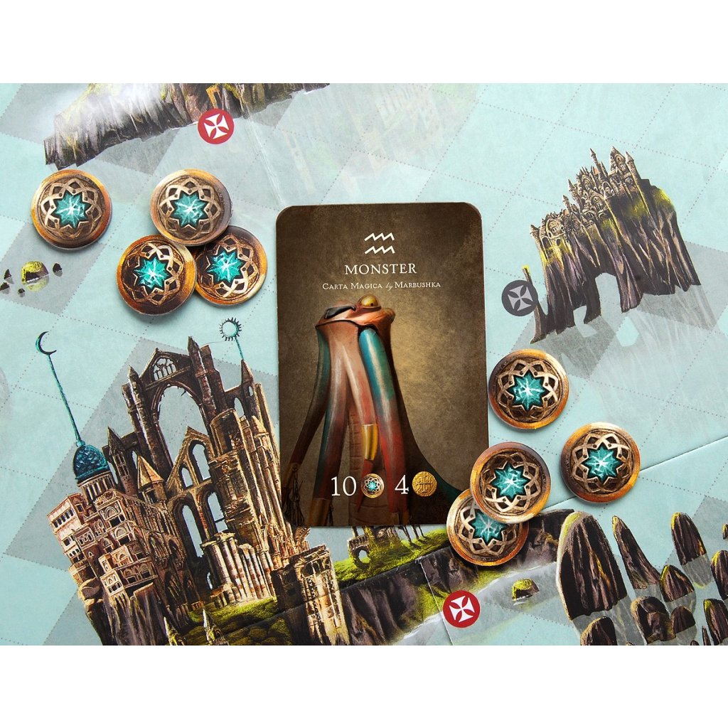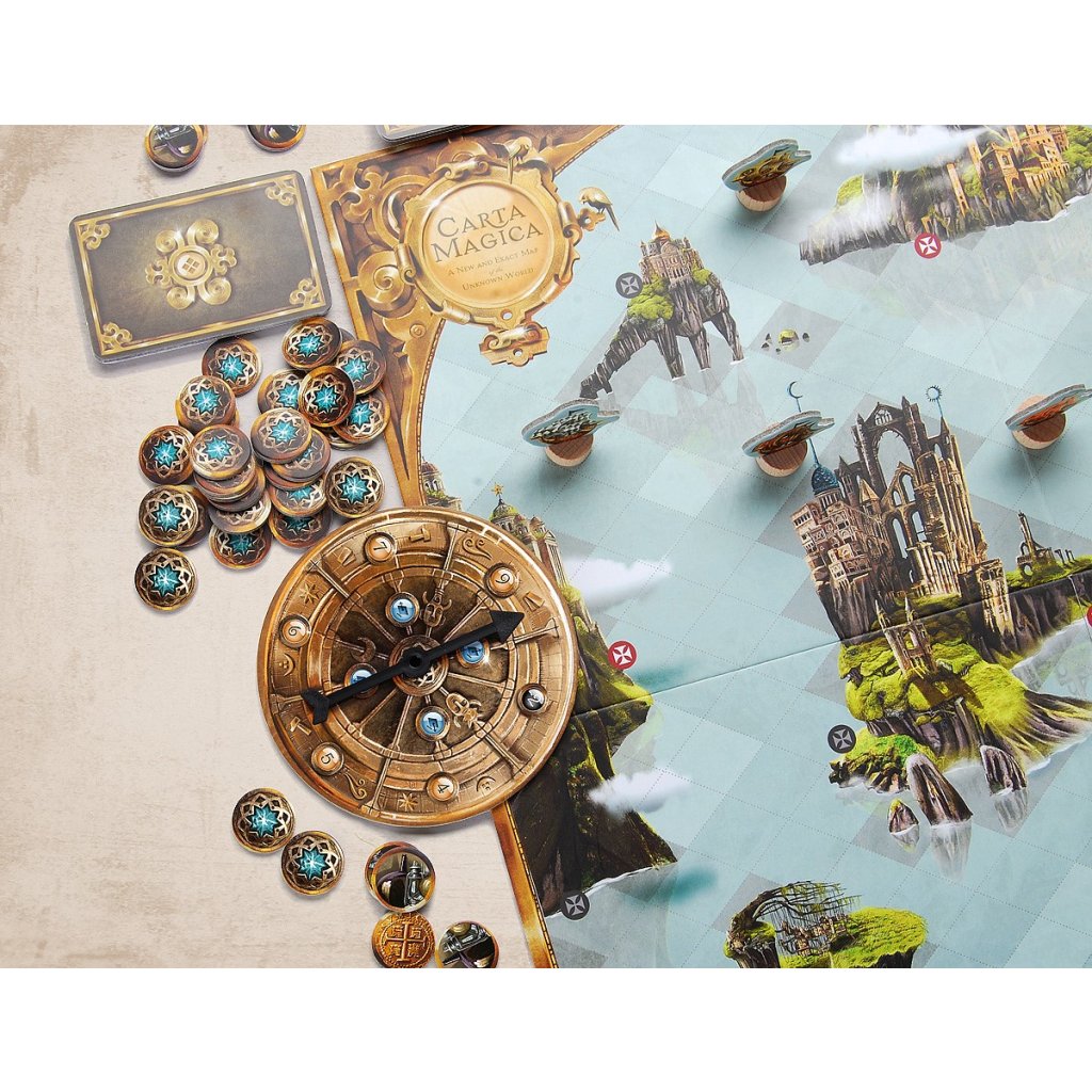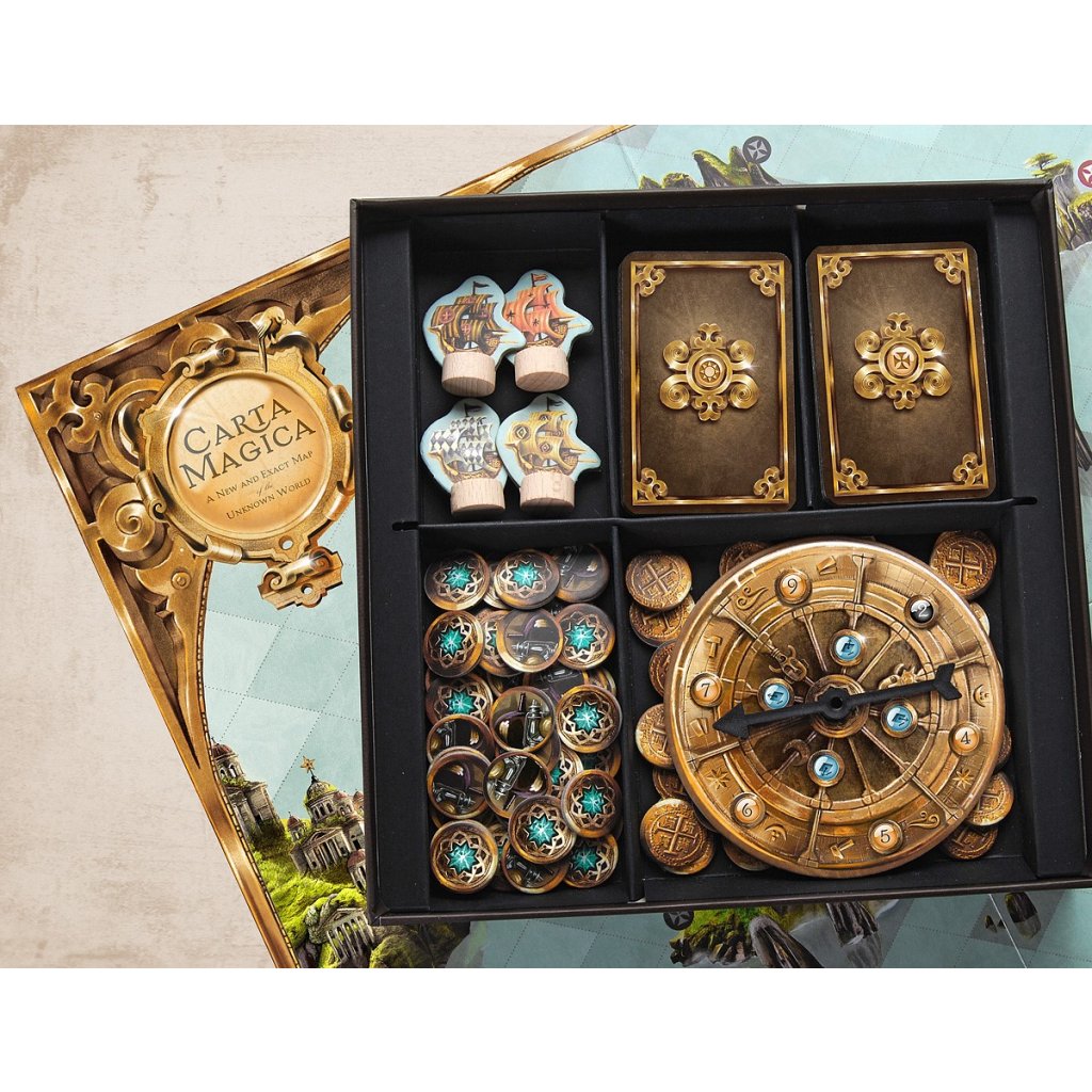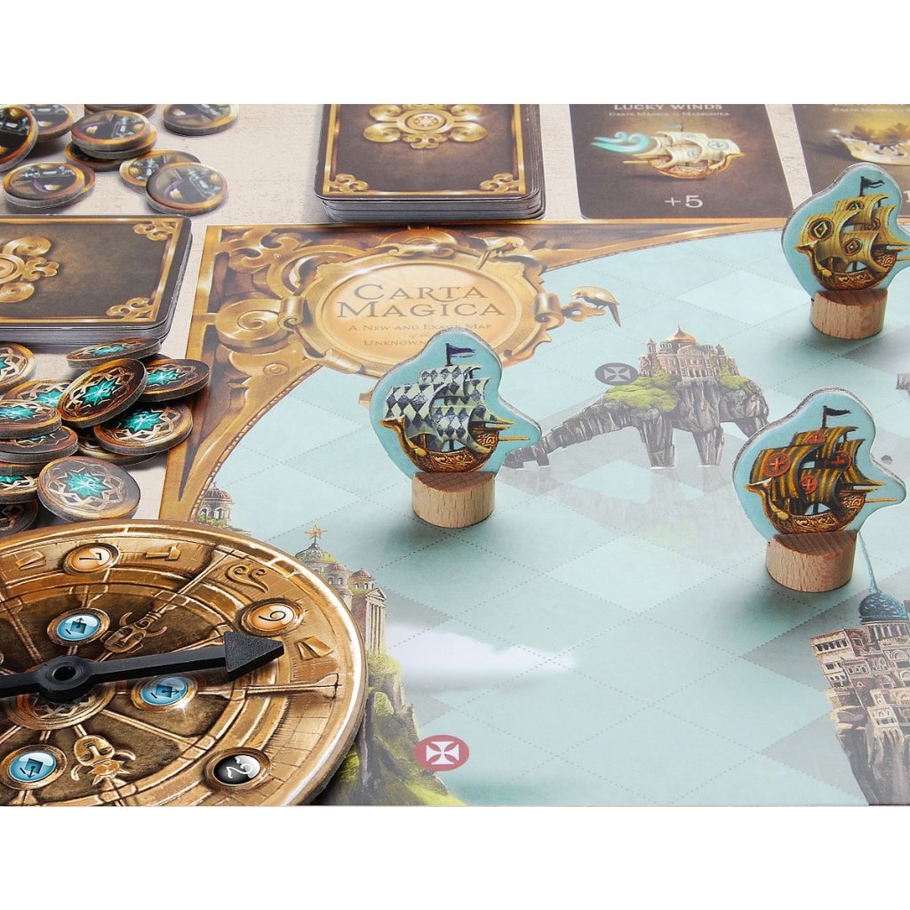 - obsah hry: 64 karet, 1 herní plán, 4 lodě, 1 kompas, 32 žetonů se zbožím, 32 žetonů se zlatem, 32 žetonů s magickou silou