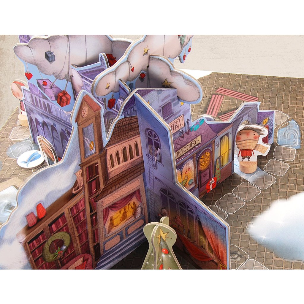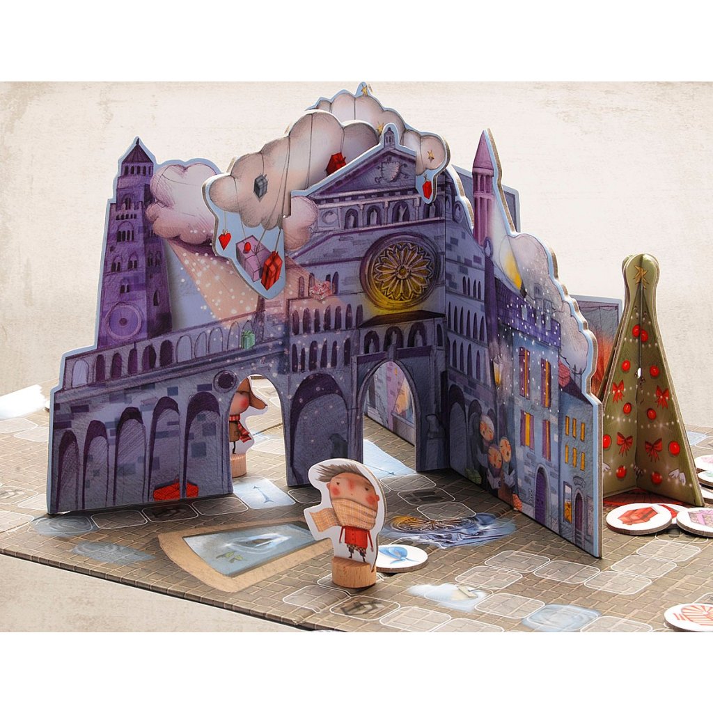 - obsah hry: 1 hrací plán, 1 městečko, 2 mráčky, 1 vánoční stromeček, 1 kostka, 6 figurek, 1 andílek, 26 karet s dárečky, 6 žetonů