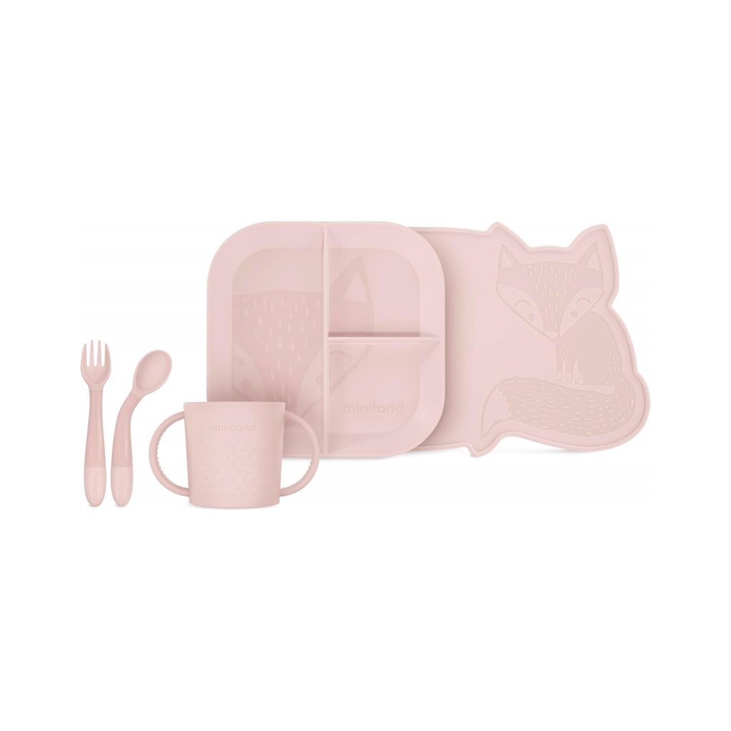 Jídelní sadu tvoří dělený talíř, hrnek se 2 uchy, pružná lžička a vidlička a protiskluzové prostírání. Dělený talíř se třemi přihrádkami je ideální i pro BLW metodu, při které se strava nemixuje a dítě se krmí samo. Lžička a vidlička jsou vyrobeny z flexibilního příjemného materiálu a mají neklouzavá, kulatá držadla, která usnadňují dítěti držení. Hrnek se dvěma uchy pomáhá dítěti naučit se pít z klasického hrnku. Všechny části jídelní sady je možné mýt v myčce. Misku i hrnek je možno používat pro ohřátí příkrmu či nápoje v mikrovlnné troubě. Vhodné pro děti od 6 měsíců.
