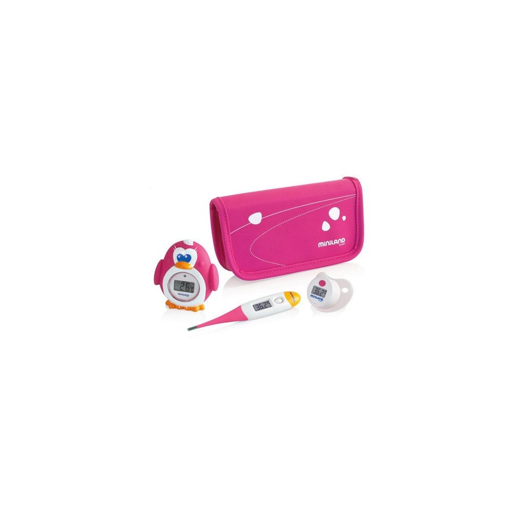 Sadu digitálních teploměrů v praktickém pouzdru tvoří teploměr s pružným koncem, teploměr do vany a dudlíkový teploměr. Teploměr s pružným koncem je určen pro rychlé a pohodlné měření teploty v podpaží, ústech i rektálně. Dudlíkový teploměr pohodlně změří teplotu v ústech miminka. Teploměr do vany funguje i jako pokojový teploměr a můžete jej nabídnout dítěti i jako hračku do koupele. Sada má růžovou barvu.