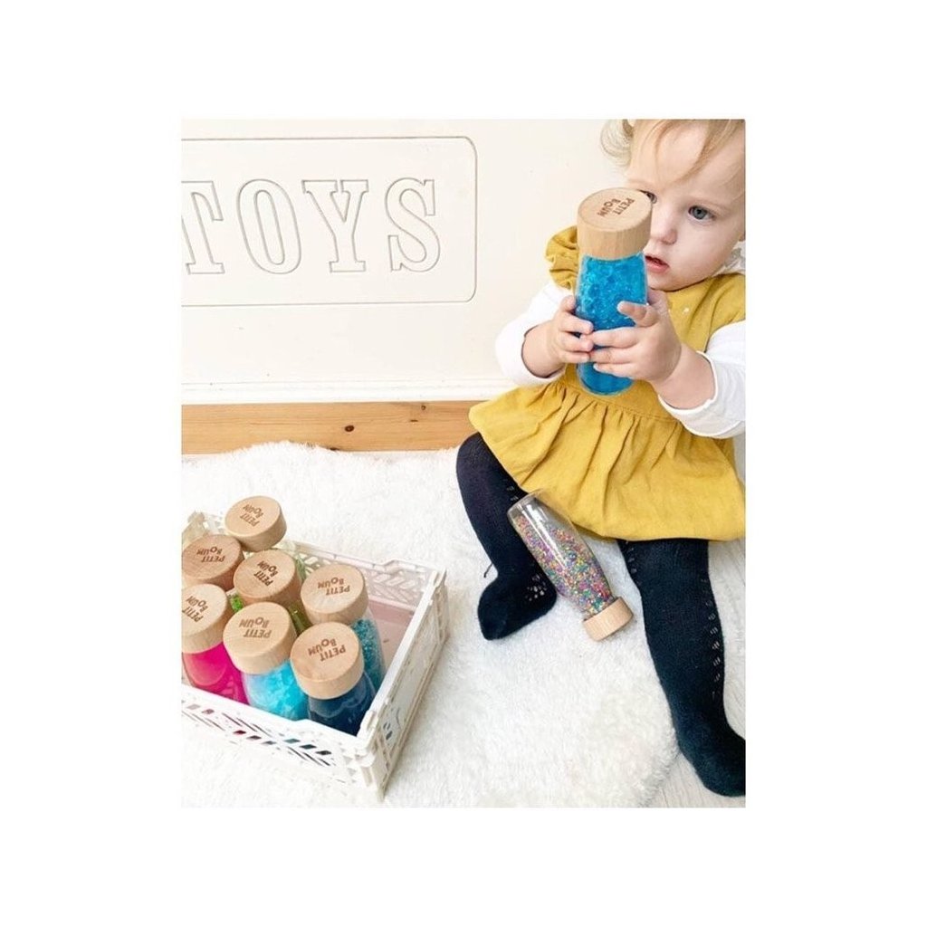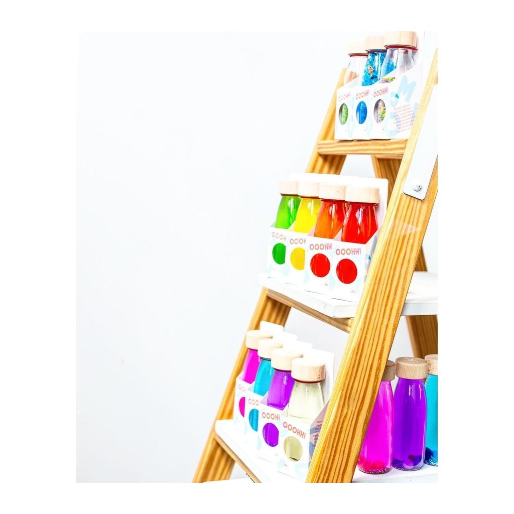 Duha je na dosah Vaší ruky. S těmito senzorickými plovoucími lahvemi PETIT BOUM, inspirovanými barevnou škálou přírody, děti objevují barvy a žasnou nad pronikajícím světlem. Senzorické lahve podporují dětskou koncentraci a pozorováním lahví si děti užijí chvíle klidu a potěšení. Pro získání magického efektu, nechte lahví procházet sluneční paprsky nebo jen nechte děti relaxovat a přemýšlet o toku třpytu, flitrech a bambulkách, plujících uvnitř lahve. Je to dokonalá senzorická hračka ke zvládání stresu a úzkosti (a nejen pro děti) …!
