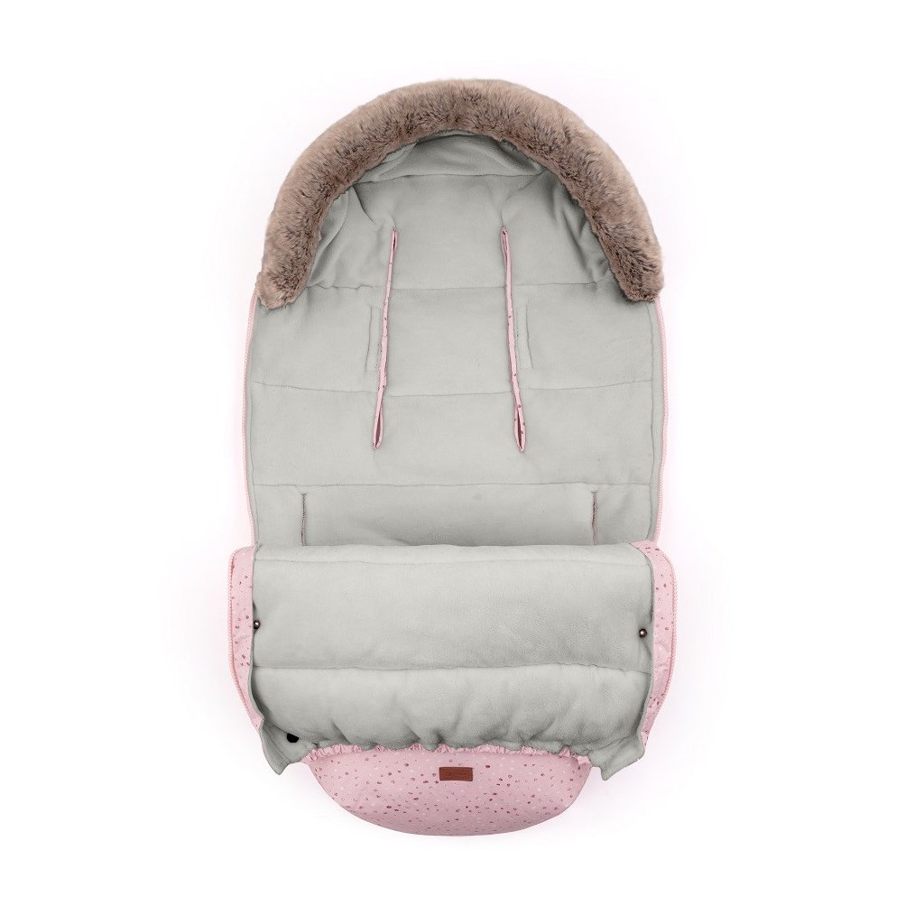 - na zadní straně je 6 otvorů na bezpečnostní pásy, díky kterým se fusak přizpůsobí jakémukoli kočárku - všestranné otvory na ramenní popruhy jsou vhodné i pro typ pásů, které nelze odpojit