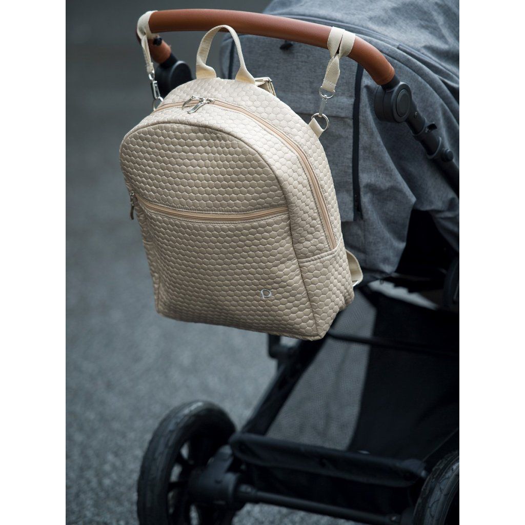 Batůžek, který můžete upevnit i na kočárek. Je polstrovaný, má vnitřní podšívku. Je vybavený 3 vnitřními kapsami (2 síťované) a navíc poutky na uchycení 2 lahviček. Vnější kapsa je uzavíratelná na zip. Součástí jsou nastavitelné popruhy a poutka na suchý zip s karabinkami pro snadné přichycení na madlo kočárku.