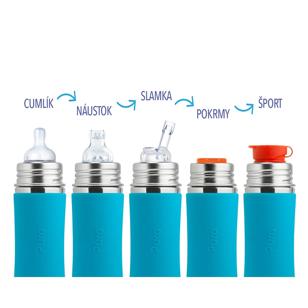 - Baby Grows… Bottle EvolvesTM - patentovaný systém umožňuje použít jakoukoliv Pura láhev s jakýmkoli Pura uzávěrem. Jednoduše tak změníte kojeneckou láhev na láhev s náustkem, brčkem nebo sportovním uzávěrem, nebo s použitím těsnícího disku na skleničku na příkrmy a drobné občerstvení. Jednu láhev tak můžete používat roky a zároveň šetříte peníze i životní prostředí.