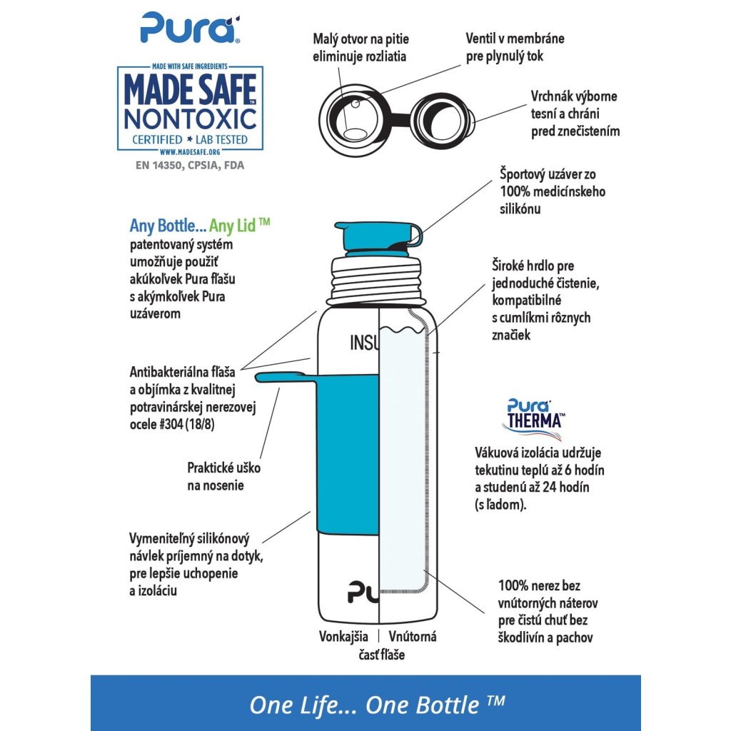 Bezpečná láhev vyrobená 100% bez plastových částí. S Pura lahvemi si můžete být jisti, že se do nápoje uvnitř neuvolňují žádné škodlivé látky a toxiny, ani příchutě a pachy jako je tomu u plastových lahví nebo lahví s plastovými víčky. Pura láhve se navíc přizpůsobují a "rostou" s Vaším dítětem. Jednoduchou výměnou uzávěrů se láhev mění z kojenecké láhve na láhev s náustkem, brčkem nebo sportovním uzávěrem či na skleničku na příkrmy a občerstvení. Můžete tak jednu láhev používat mnoho let. One Life… One BottleTM.