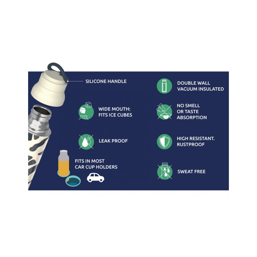 Termoska Quokka Pulse z vysoce kvalitní dvoustěnné oceli se spolehlivým, 100% těsnicím uzávěrem udrží váš nápoj dle potřeby teplý či studený. Široké hrdlo umožňuje vložení kostek ledu. Termoska udrží teplotu studeného nápoje s ledem až 48 hodin, studeného nápoje až 16 hodin a teplého nápoje až 12 hodin. Silikonové poutko, které je zakomponované do víčka láhve, usnadňuje přenášení. Quokka Pulse je součástí kolekce lahví a hrnků Drop Safe se speciálním dnem Smartgrip®, které při postavení na hladký povrch brání převržení a nechtěnému vylití obsahu láhve. Tvar láhve je vhodný do většiny držáků nápojů v autě.